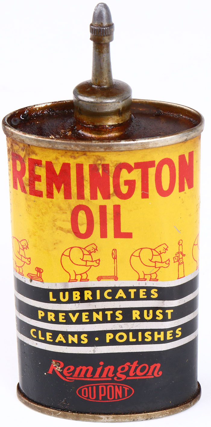 Remington oil tin, lead spout and lead cap, partial, oil is leaking out. Grade: Excellent - Value: 10 to 50