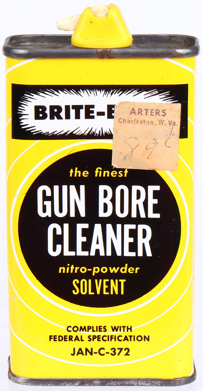 Brite-bore Gun bore cleaner oil tin, lead spout, Full, all bright and clean. Grade: Excellent + - Value: 2 to 40