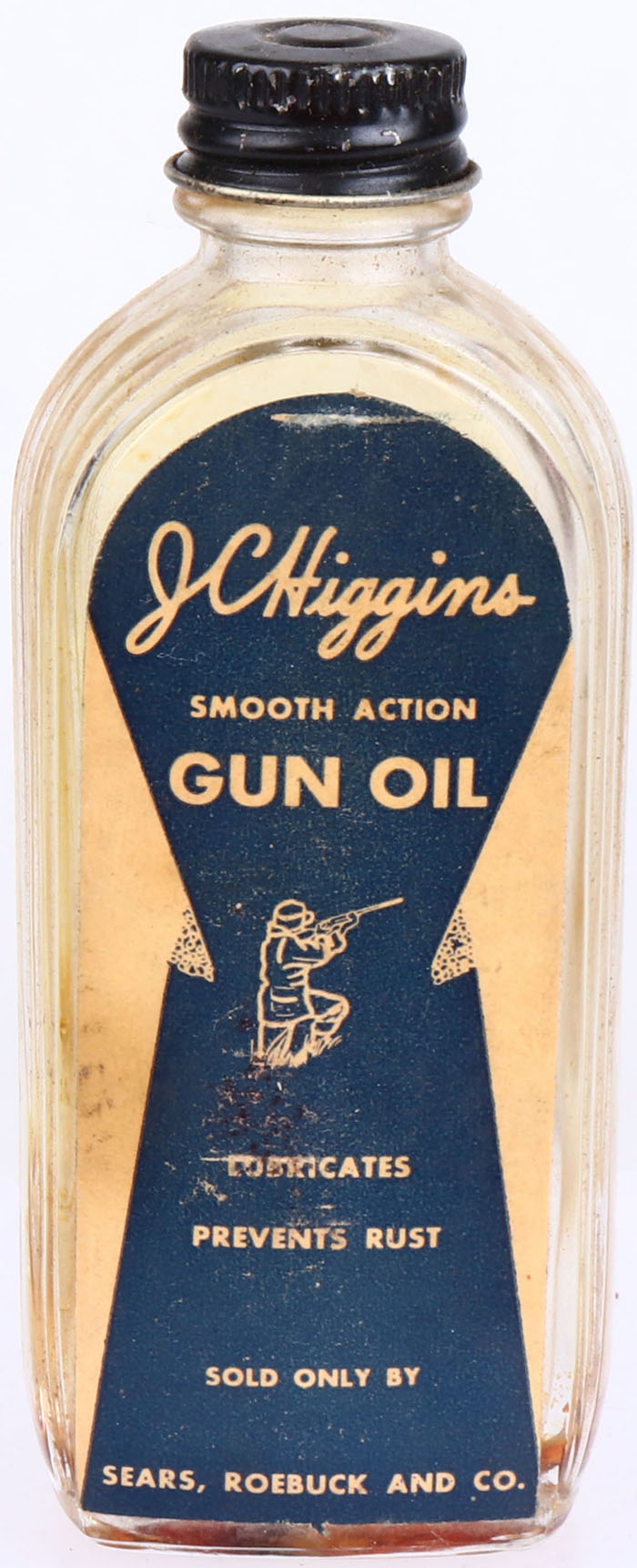 JC Higgins Gun Oil glass jar with paper label, Empty, solid label Grade: Very Good ++ - Value: 10 to 50