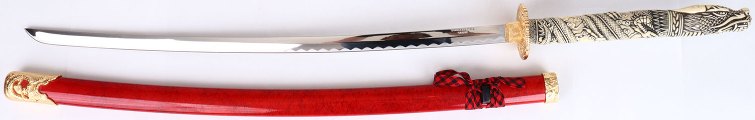 Large sword, modern made, beautiful handle and hilt, stainless steel blade is sharp, 28'' blade, has beautiful sheath. Grade: MINT - Value: 50 to 300