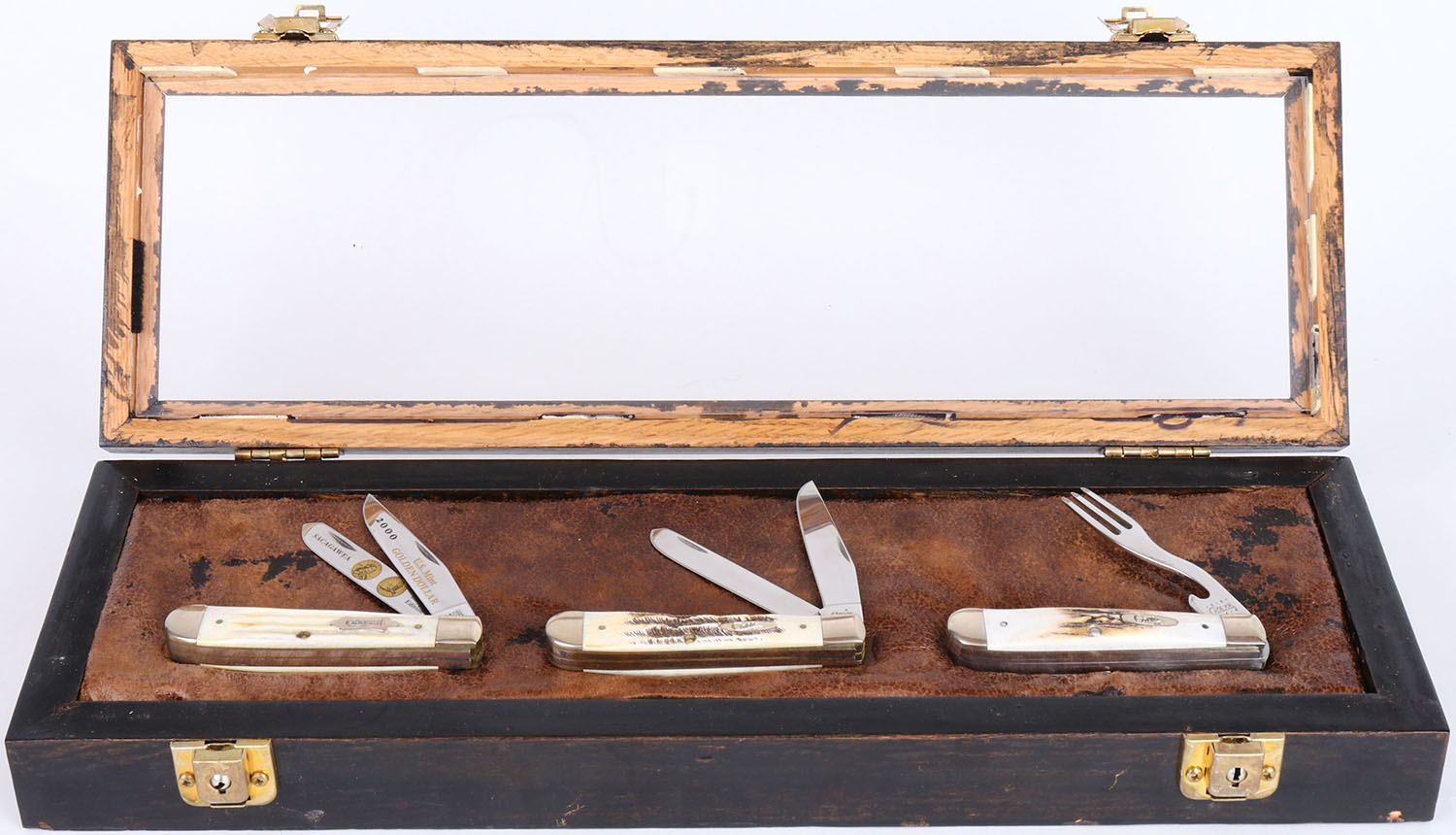 Lot of 3 RARE Case knives, in a neat wood display box, each knife is bright and clean and has 2 blades/tools, bone handles. Grade: Excellent ++ - Value: 300 to 700