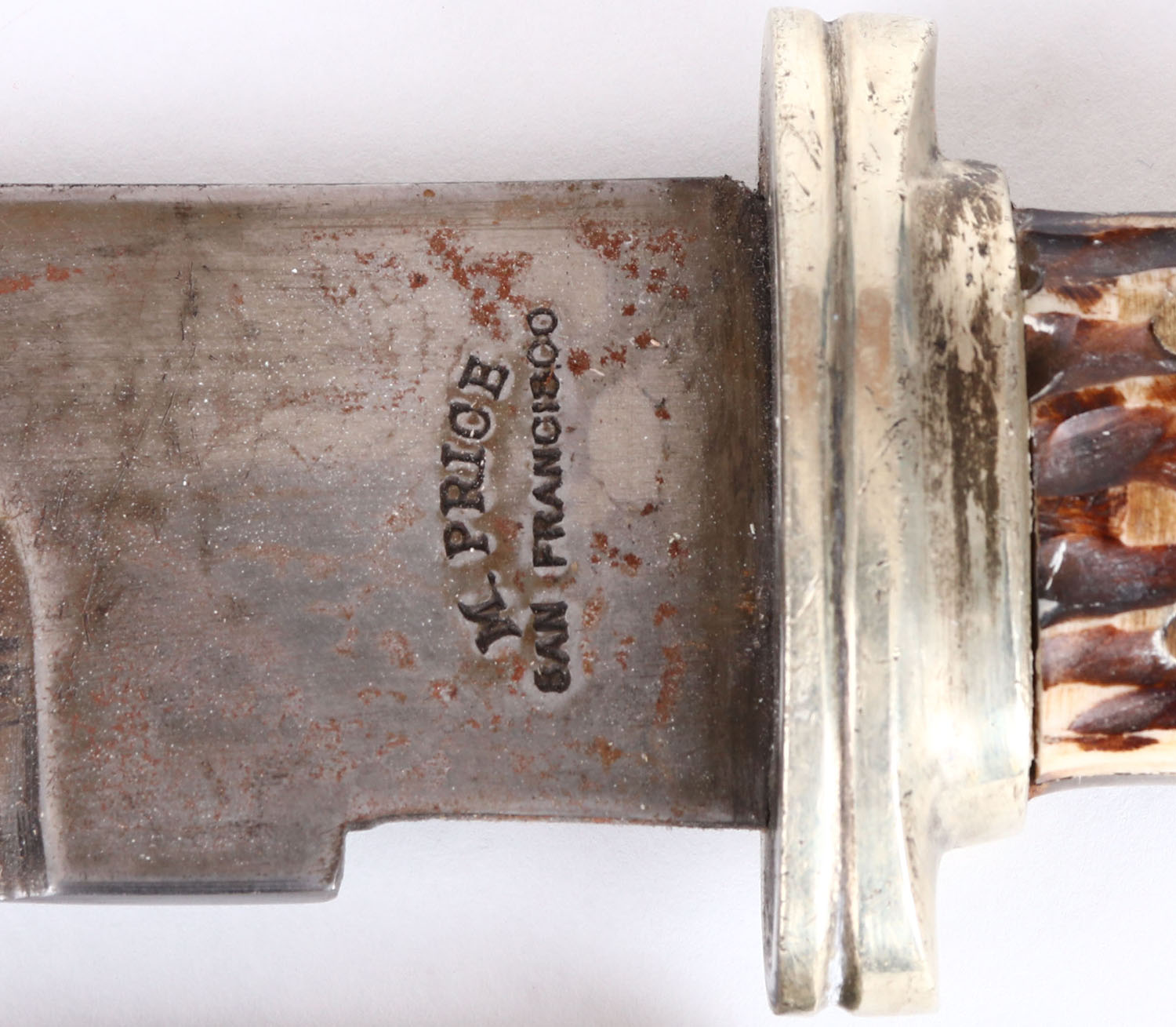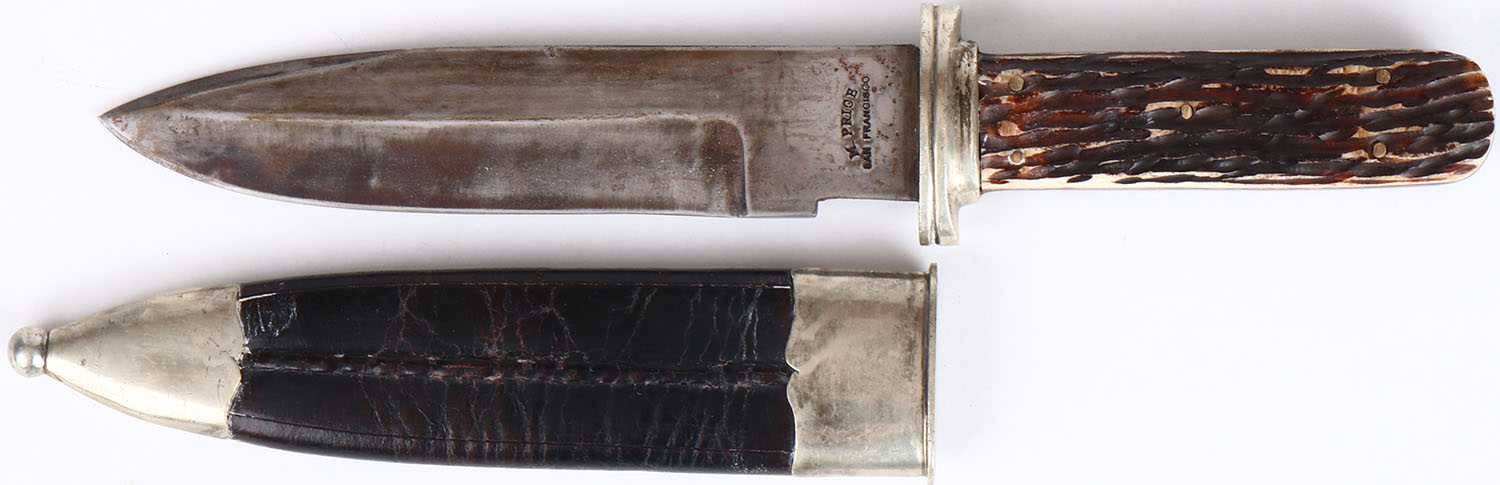 Large M. Price San Francisco bowie knife, 7 1/2 fixed blade, full hilt, has nickel and leather sheath, stag handle, handle has age soiling. Grade: Very Good ++ - Value: 400 to 800
