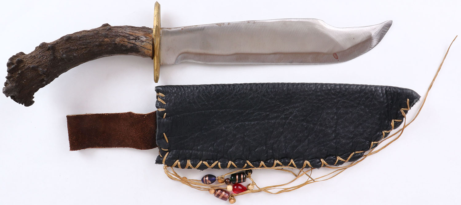 Large crude made knife, no markings, wood handle, 10'' blade, has leather sheath. Grade: Good - Value: 10 to 100