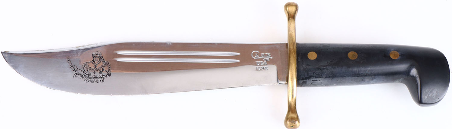 Large CASE knife, 9 1/2'' blade, blade has an image of a frontiersmen, full hilt, celluloid handle, bright and clean. Grade: Excellent - Value: 50 to 300