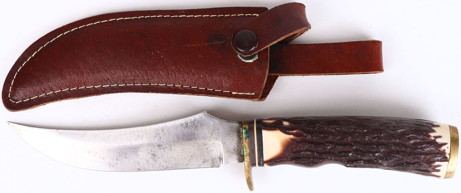 Schrade knife, with sheath, 5'' blade, has age soiling. Grade: Very Good - Value: 16 to 60