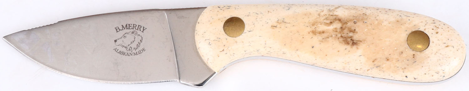B. Merry fixed blade knife, Alaskan made. Walrus Jaw Bone handle, 3'' blade, very bright and clean. Grade: Very Good - Value: 30 to 150