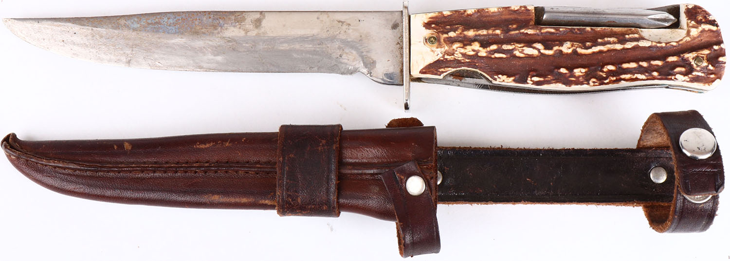 D.B.G.M. Decora-Solingen fixed blade knife with folding blade and tool, bone handle with, Made in Germany, has age soiling, 5'' blade longest blade, has scratch to blade and has been sharpened, has leather sheath. Grade: Very Good - Value: 50 to 150