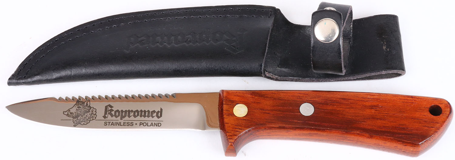 Kopromed fixed blade knife, made in Poland, wood handle, all bright and clean, 4 1/2'' blade, has original leather sheath. Grade: Excellent - Value: 16 to 80