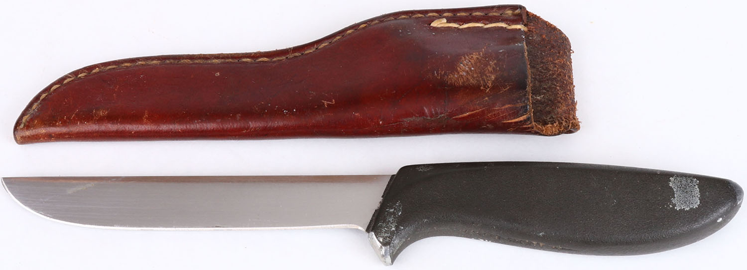 Unmarked fixed blade knife, has age soiling and scuffing, 4 3/4'' blade, has a Gerber leather sheath, knife fits sheath perfectly. Grade: Very Good ++ - Value: 10 to 50