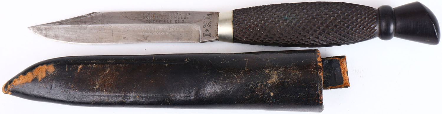 G. Wostenholm & sons Washington Works Sheffield, Eng., Abercrombie & Fitch fixed blade knife with leather sheath, 4 1/2'' blade, some scratching to blade. Grade: Very Good ++ - Value: 50 to 150