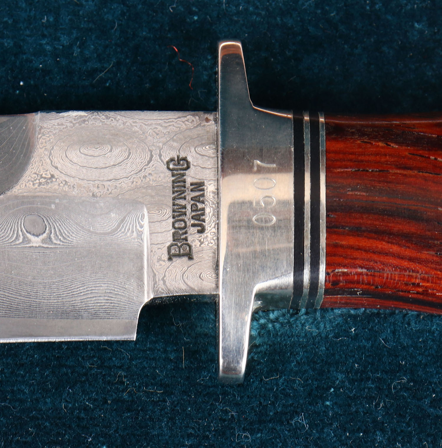 RARE! Browning Model 3816 Double edged Damascus Hunter fixed blade knife, cocobolo wood handle, blade is 3 5/8'' long, in orignal wood box and with orignal shipping box, 1 of 1000, #507. Grade: MINT - Value: 400 to 800