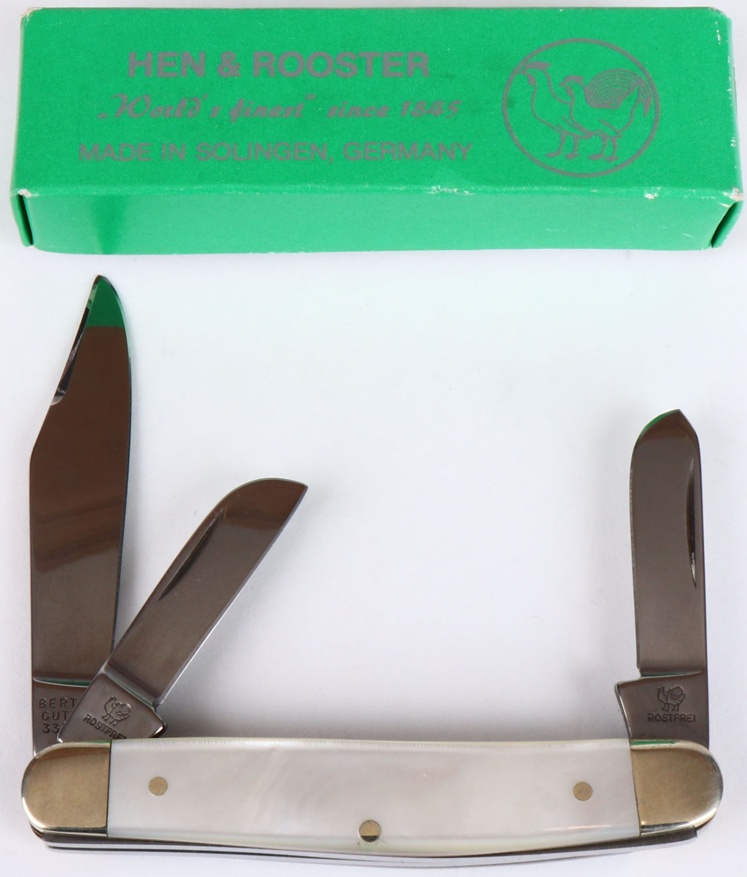 Hen & Rooster folding knife, in orignal box, 2 blades, mother of Pearl handles. Grade: Excellent - Value: 30 to 100