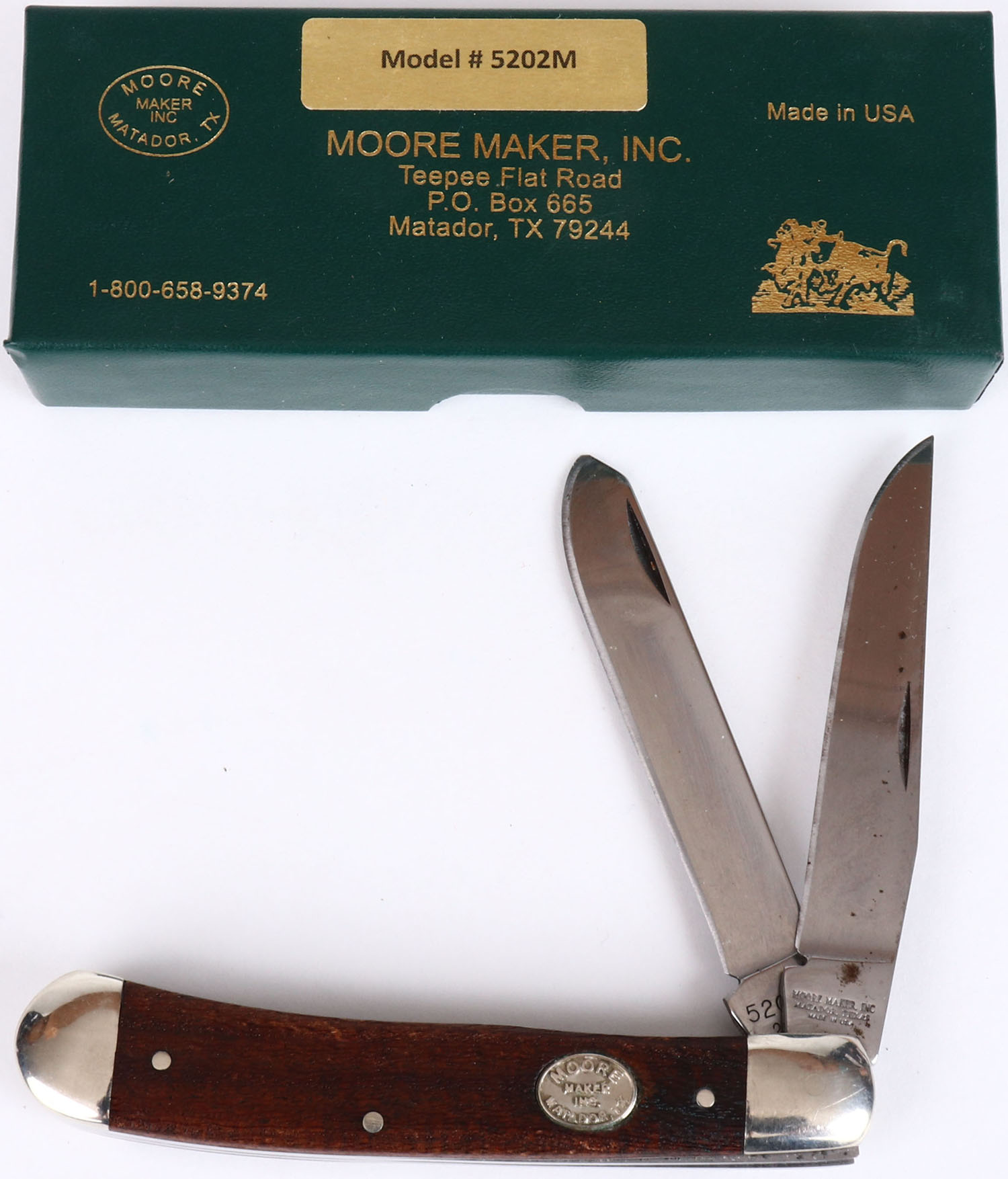 Moore Maker inc. folding knife, #5202M, 3'' blade, wood handle, in original box, some age soiling to blade. Grade: Very Good ++ - Value: 20 to 80