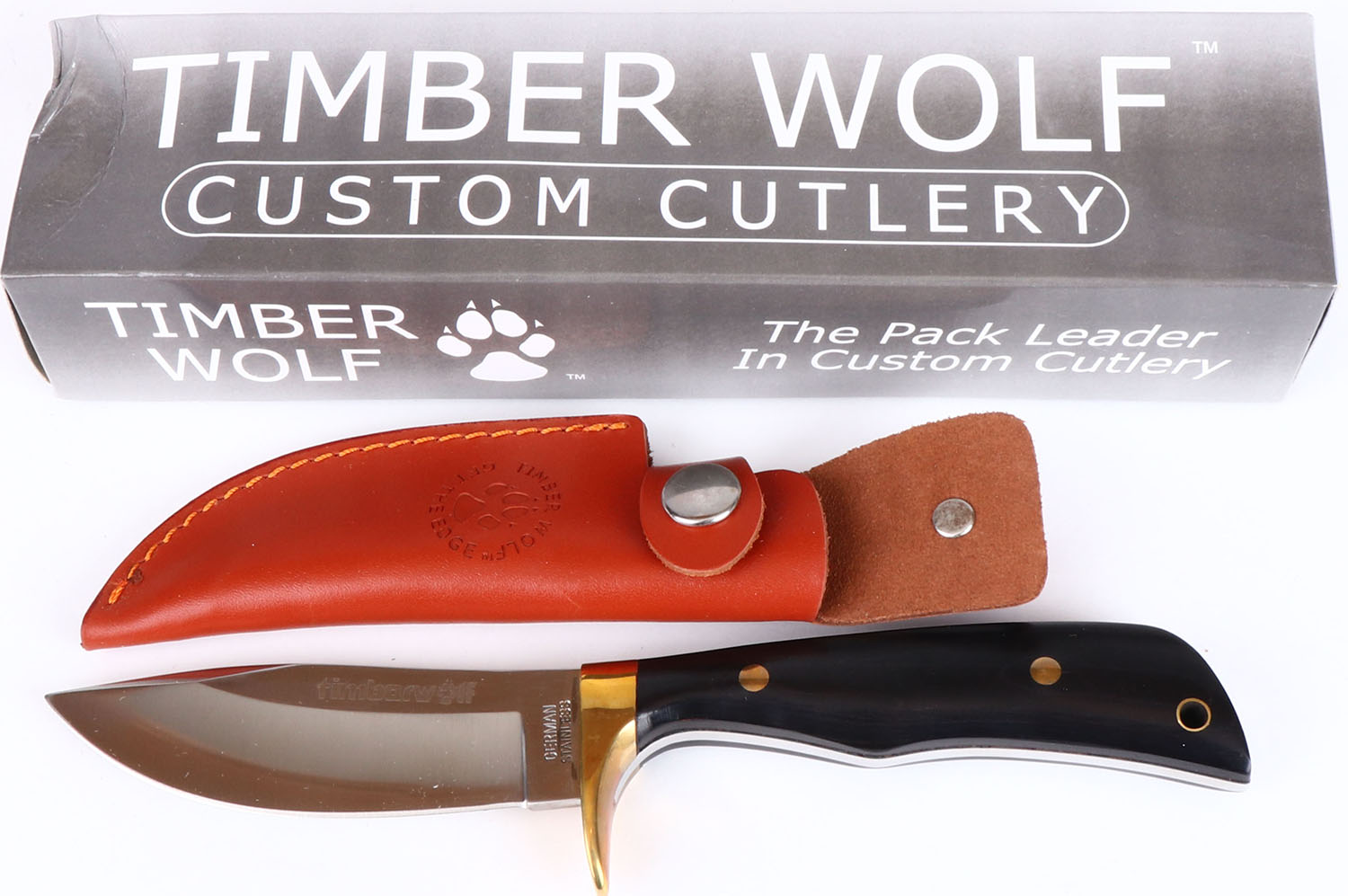 Timber Wolf fixed blade knife in orignal box, 3 1/2'' blade, has sheath, NIB. Grade: Excellent ++ - Value: 20 to 80