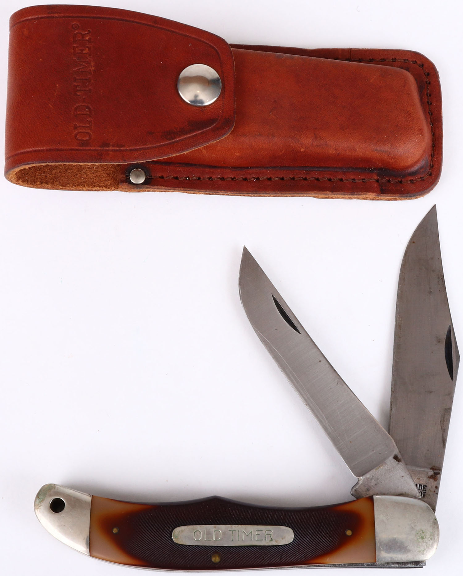 Old Timer folding knife, 2 blades, 4'' blade, has leather sheath, some light age soiling. Grade: Excellent - Value: 20 to 80