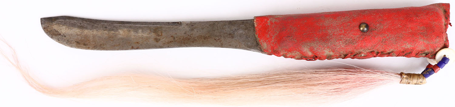 Plains Indian 12'' in length Scalp Knife. Bison hide wrapped handle, brass tacks, trade beads, red dyed horse hair drop. Museum Quality. - Value: 60 to 400