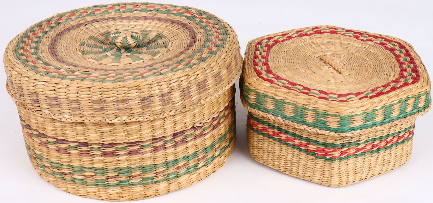 Reed Indian baskets from the Pacific Northwest. Early 20th century. 6 1/4'' tall 5'' wide. Grade: Excellent - Value: 40 to 200