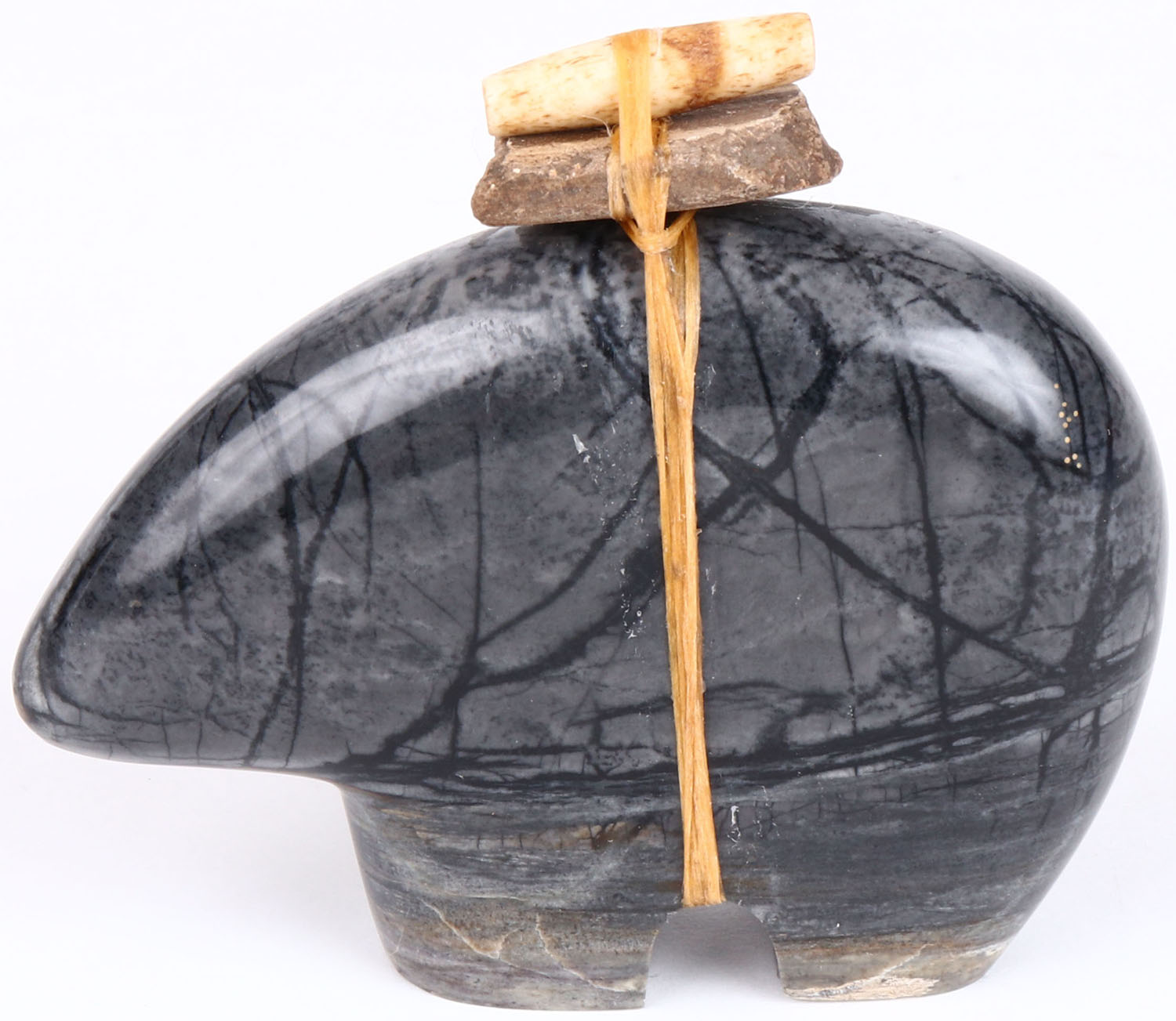 Navaho carved stone Effigy Medicine Bear. Has a prehistoric pottery shard and a long bone bead attached with sinew. Grade: Excellent - Value: 50 to 300
