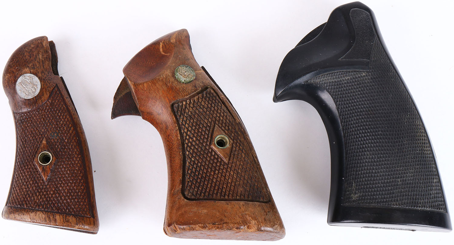 Lot of 3 pistol grips, 2 S&W wood grips and a Pachmayr hard rubber grips. Grade: Very Good - Value: 16 to 80