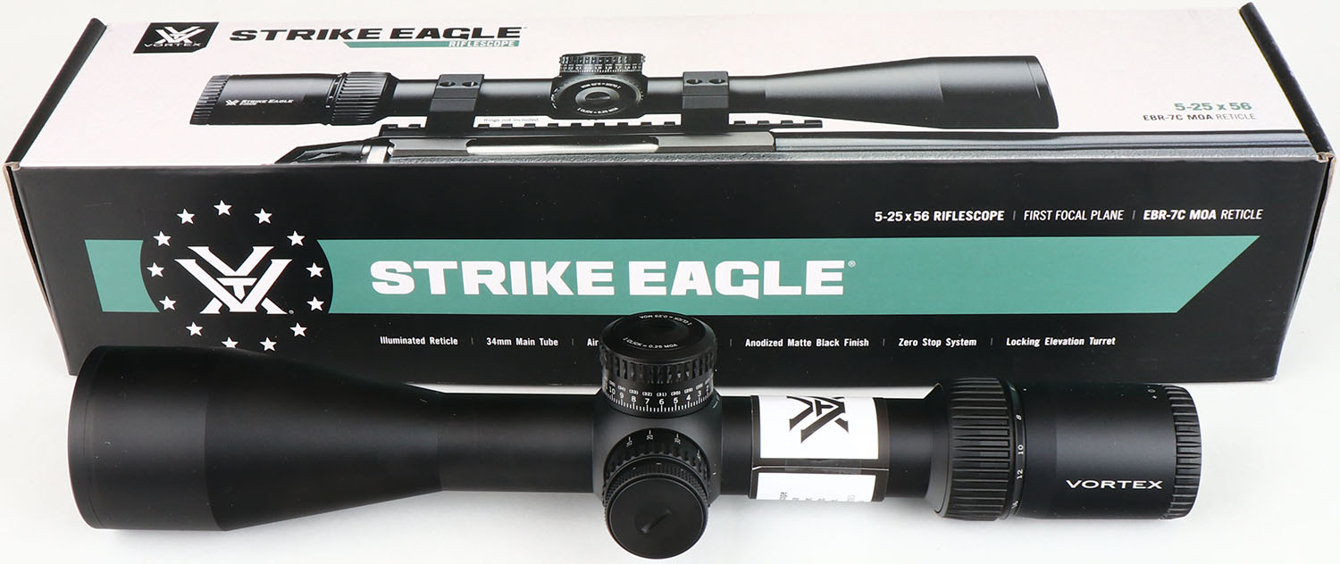 Vortex, Strike Eagle, 5-25 x 56mm, Variable Magnification Rifle Scope, NIB, 34mm Tube Diameter, First Focal Plane EBR-7C (MOA) Illuminated Reticle, Adjustable Parallax from 15 Yards to Infinity, Fast Focus Eyepiece, Nitrogen Gas Purged Housing, Waterproof, Fog proof, Shock Proof, 3.7 Inches of eye relief, 14.6 Inches long, weighs 30.4 Ounces, Medium Height exposed locking turrets have 110 MOA of internal adjustment for elevation and 78 MOA for windage, 1/4 MOA Clicks, very small amount of play between clicks but overall very positive and audible, Fully Multi-Coated Glass is outstanding, comes with RZR Zero Stop, Sun Shade, cleaning cloth, CR2032 Battery, and the unmatched Vortex VIP Unconditional Warranty. Grade: MINT - Value: 800 to 1000