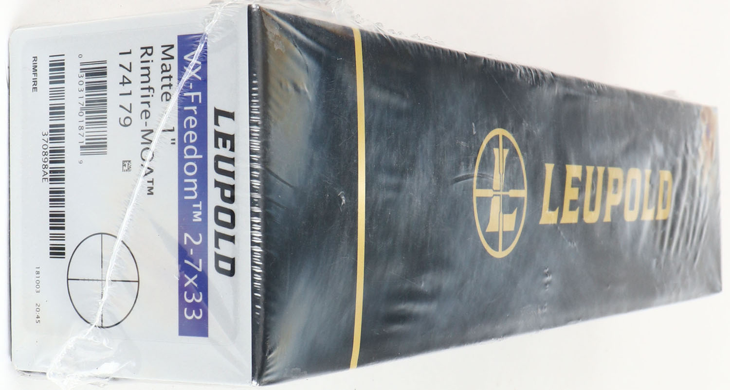 Leupold, VX Freedom 2-7 x 33mm Variable Magnification Rifle Scope, SEALED NIB, Rimfire MOA Reticle, 1'' Tube Diameter, Second focal plane, waterproof, shockproof, fog proof, fast focus eyepiece, medium height finger adjustable capped turrets, fixed parallax, 11.1 ounces, 11'' overall length, 4.7-3.7 inches of eye relief, windage/elevation adjustments of 75 MOA, fully multi-coated lenses, comes with Leopold's Full Lifetime Guarantee. Grade: MINT - Value: 200 to 400