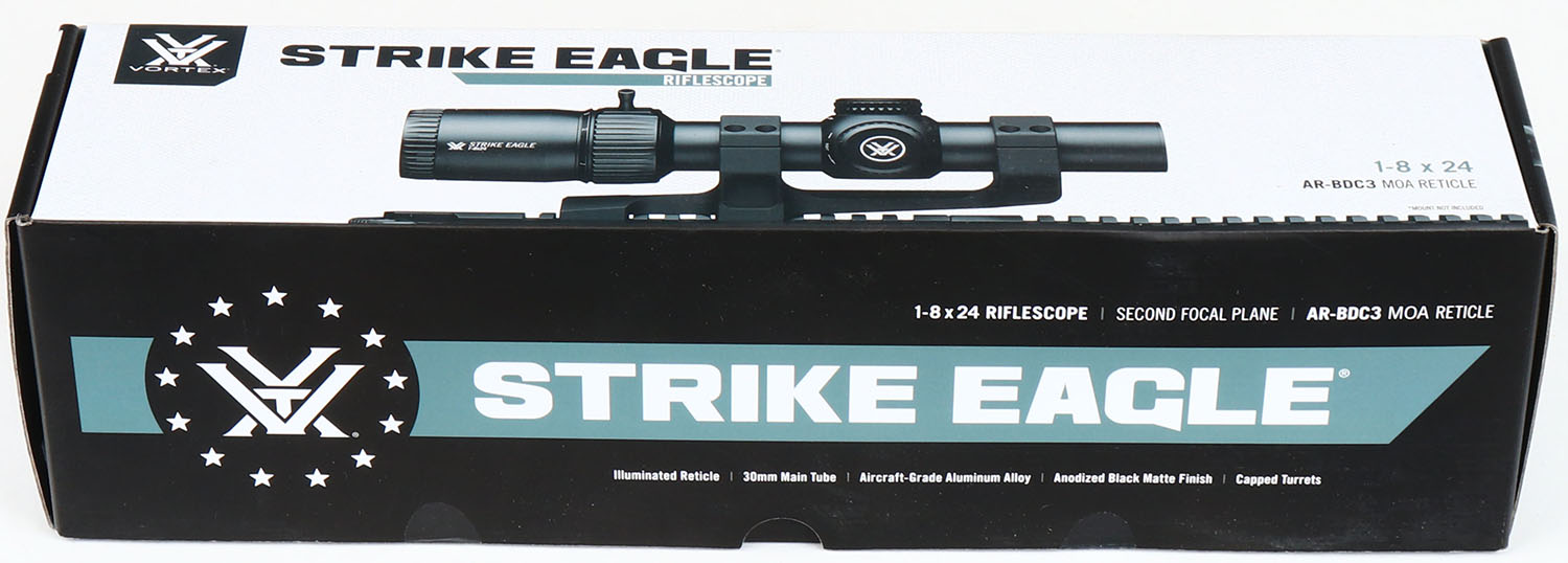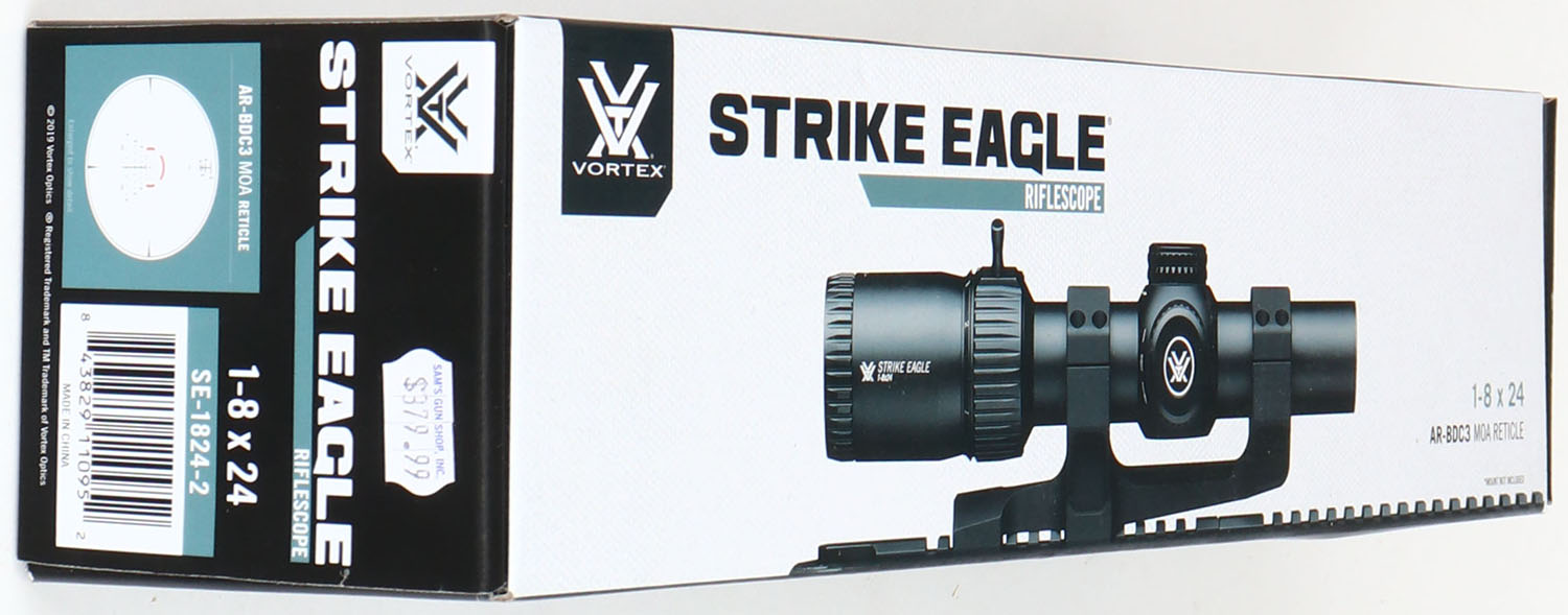Vortex, Strike Eagle, 1-8 x 24mm LPVO Rifle Scope, SEALED NIB, 30mm Tube Diameter, Second Focal Plane, AR-BDC3 Illuminated Reticle, Nitrogen Gas Purged Housing, Waterproof, Fog proof, Shock Proof, 3.5 Inches of eye relief, 10 Inches long, weighs 17.6 Ounces, Low profile capped turrets have 140 MOA of internal adjustment, 1/2 MOA Clicks, comes with cleaning cloth, Flip Caps, Thread-In Throw Lever, CR2032 Battery, and the unmatched Vortex VIP Unconditional Warranty. Grade: MINT - Value: 400 to 800