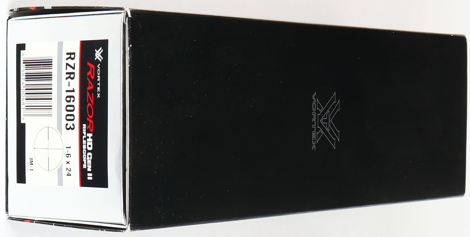 Vortex, RazorHD Gen II, 1-6 x 24mm, LPVO Rifle Scope, JM-1 (MOA) Illuminated Reticle, Matte Stealth Shadow Black Finish, Waterproof, Fog proof, Shockproof, Second focal plane, 30mm Tube diameter, Low profile finger adjustable turrets are capped, weighs in at 21.5 ounces, 10 inches overall length, 4 inches of eye relief, fast focus eyepiece, parallax fixed at 100 yards, 1/2 MOA adjustments, clicks are positive and audible, locking illumination, XRPlus Fully Multi-Coated Japanese glass is beautiful - clear and unblemished with a very large sight picture, comes with 1 CR2032 battery as well as the Vortex VIP Unconditional Warranty, Scope is MINT, box has minor wear. Grade: Excellent ++ - Value: 1200 to 2400