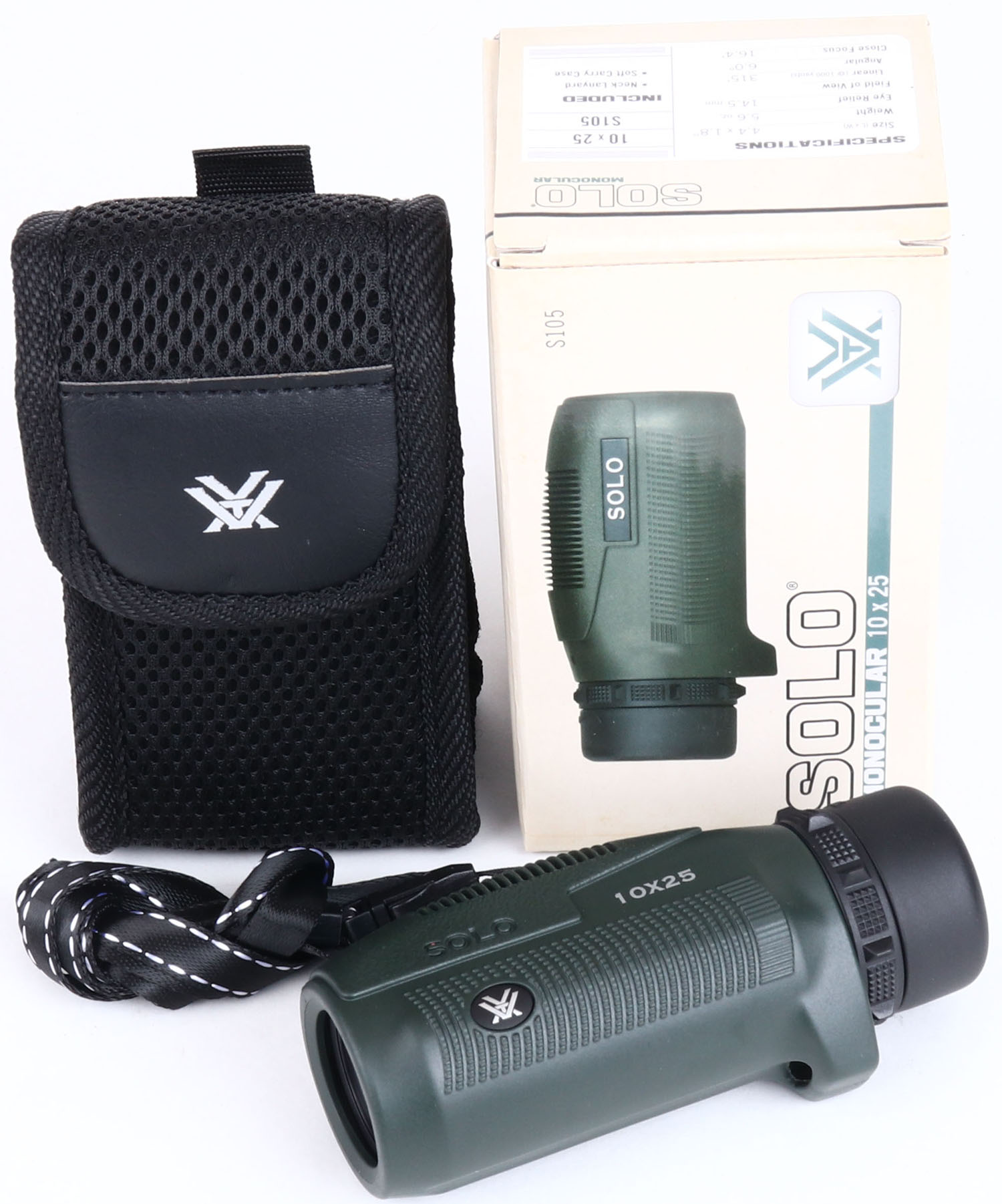 Vortex, Solo, 10 x 25mm Monocular, NIB, Comes with carrying case, neck strap, utility clip and rain guard, 10x magnification, 14.5 mm of eye relief, Field of view at 1000 yards is 315 feet, Fully multi-coated lenses, waterproof, 4 1/2'' long and weighs just 5.6 ounces, comes with the unbeatable Vortex VIP Unconditional lifetime warranty. Grade MINT - Value: 80 to 160