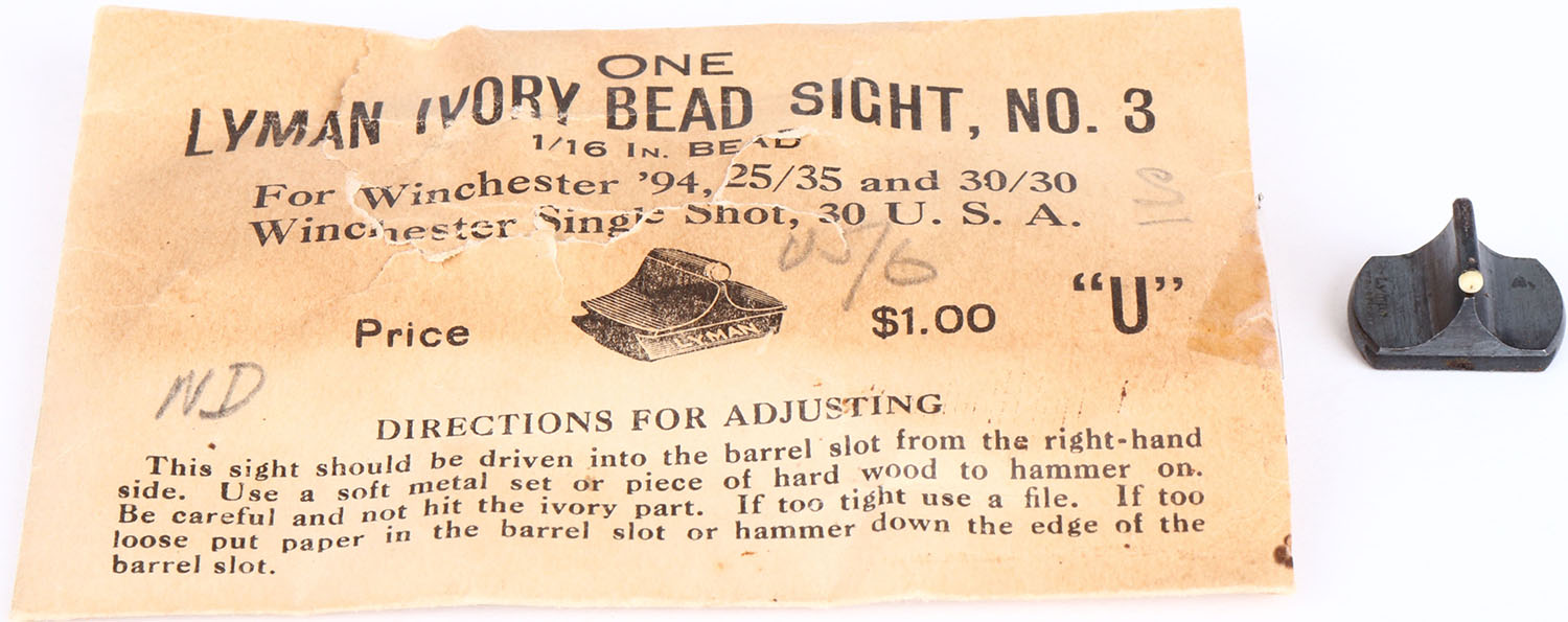 RARE! Lyman Ivory bead sight, in original packaging, No. 3, all bright and clean. Grade: Excellent - Value: 100 to 500
