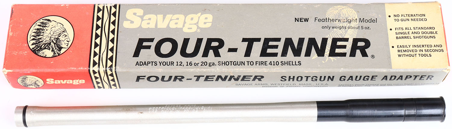Savage Four-Tenner, 20 ga. In orignal box, box has age soiling. Grade: Excellent - Value: 80 to 300
