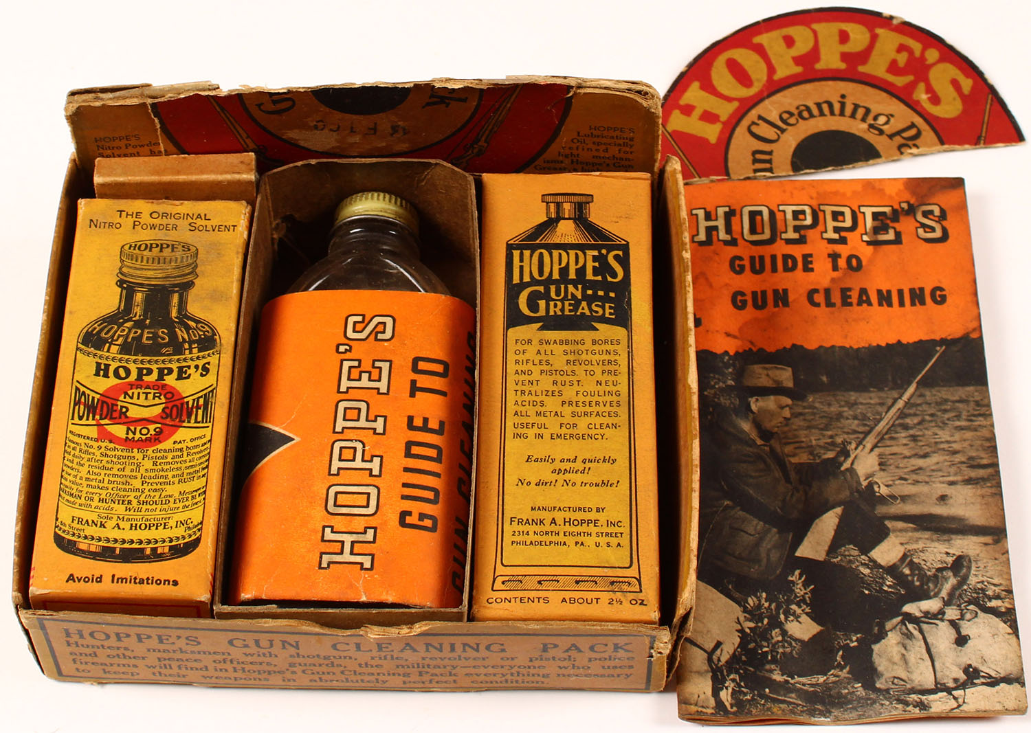 Hoppes Gun Cleaning Pack, Full Kit with oil tin, Very Early, has age soiling to contents and box, lid is torn. Grade: Very Good - Value: 10 to 50