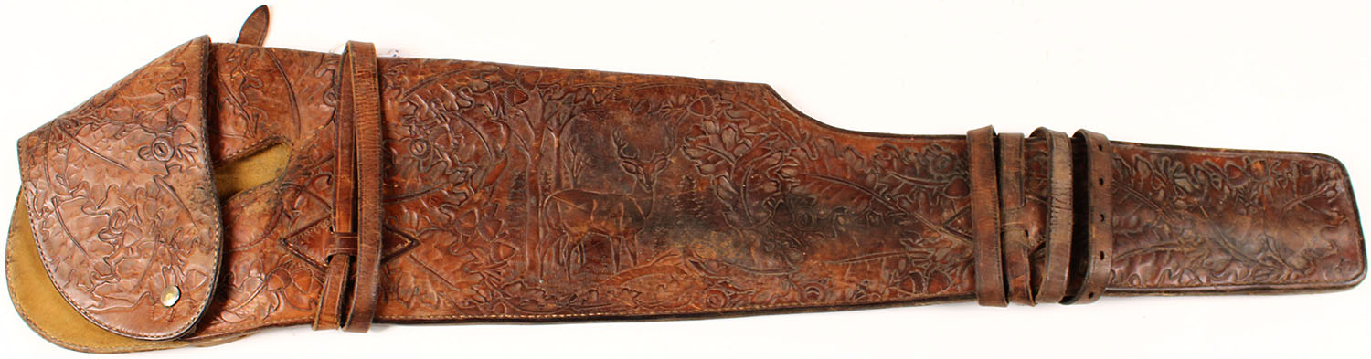 RARE! Browning Bro. Ogden, UT. Rifle scabbard, beautiful tooling of a scene in a forest with various animals, 37 1/2'' OAL, has age soiling and wear. Grade: Very Good - Value: 200 to 400