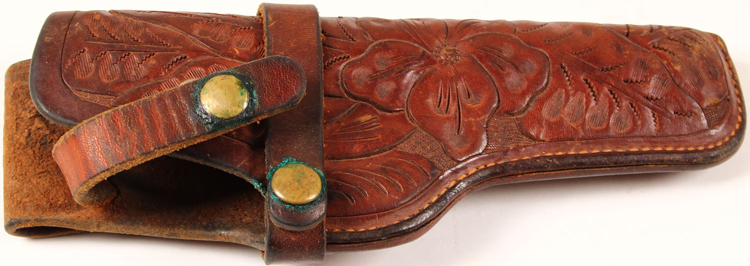 Hunter Leather pistol holster, has age soiling and beautiful tooling. Grade: Very good - Value: 4 to 60