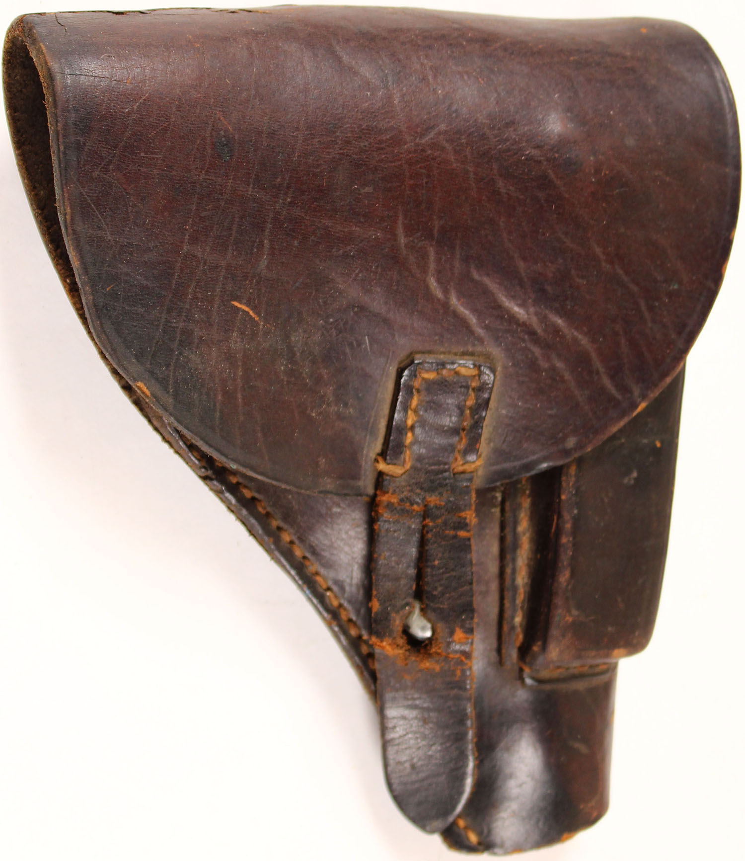 Unmarked Leather pistol holster, has place for an extra magazine, has age soiling. Grade: Very good - Value: 2 to 40