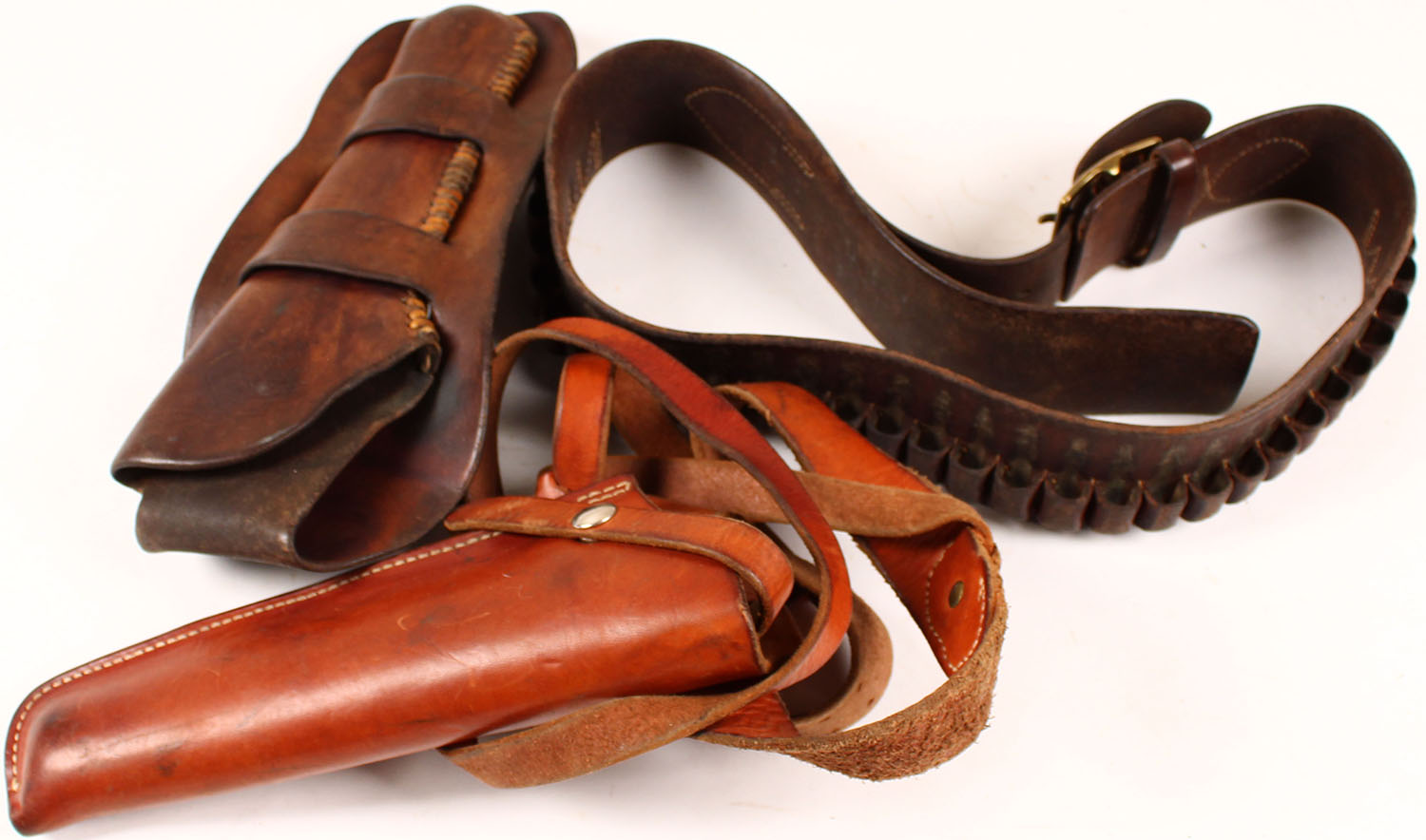 Lot of 3 Leather pistol holsters and belt. Grade: Very good ++ - Value: 6 to 60