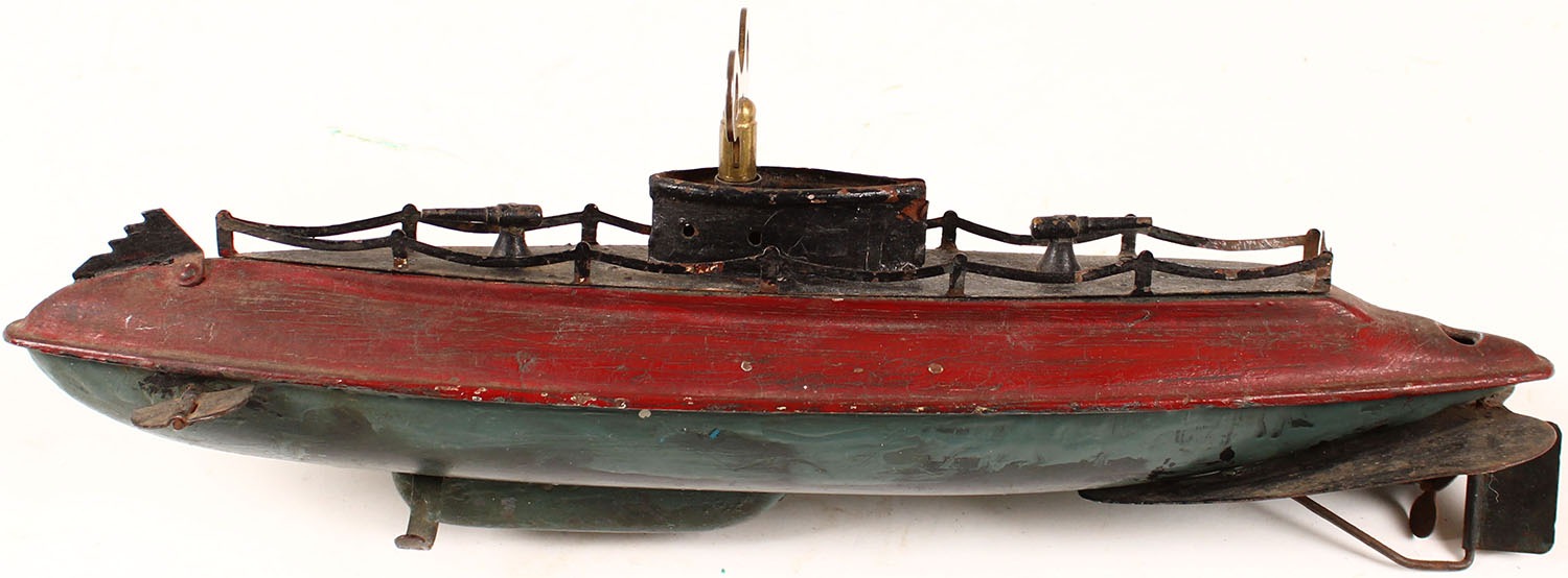 Antique metal toy submarine with turn key, has scuffing and appears to have been re-painted. Grade: Very Good - Value: 20 to 200
