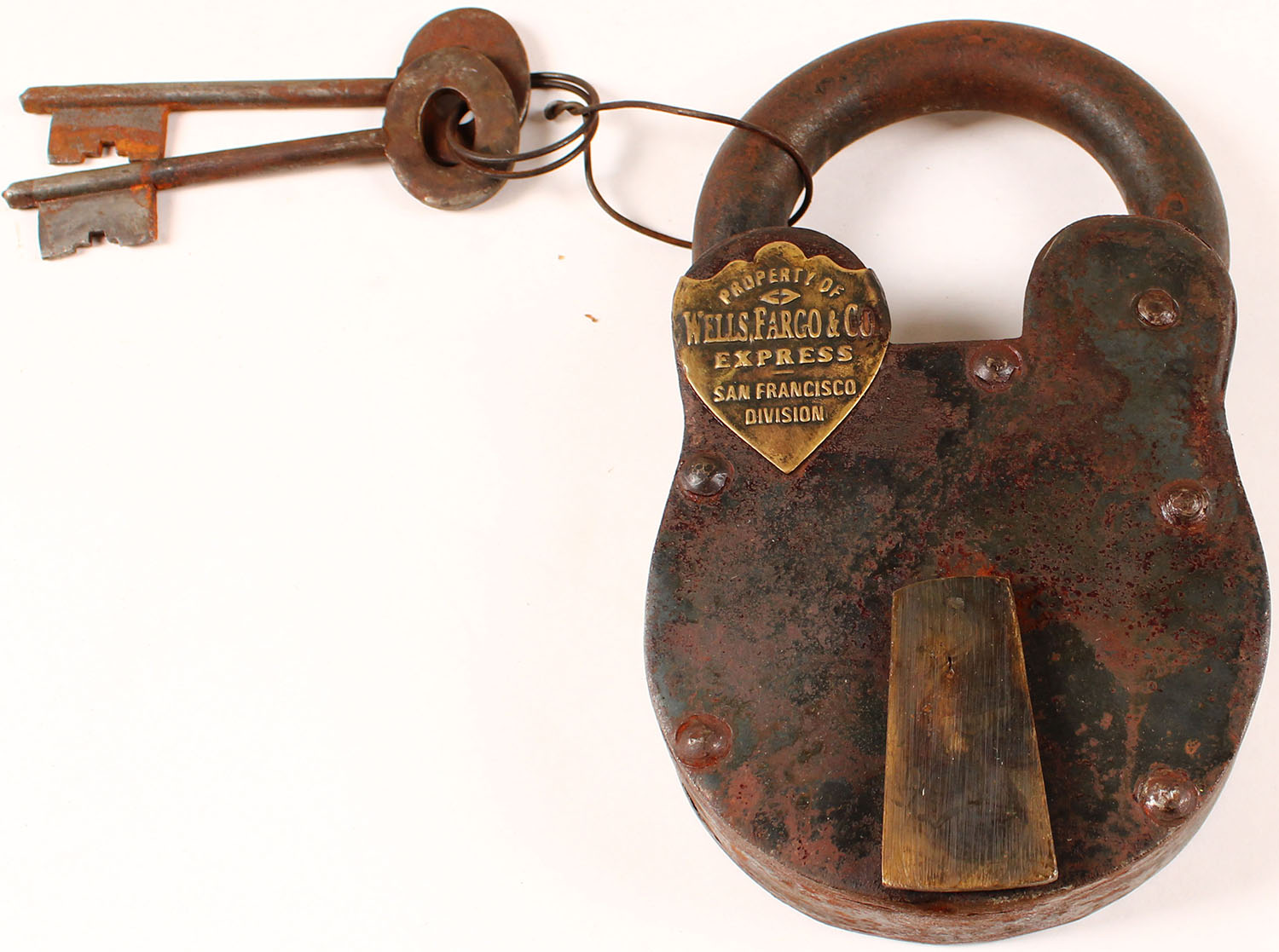 RARE! VERY LARGE! Wells, Fargo & Co. Express steel padlock, brass plate, 2 key, has rust. Grade: Very Good - Value: 10 to 100