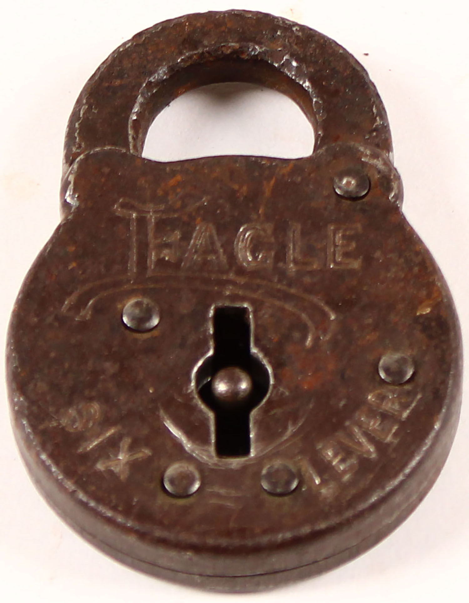 Antique small ''Eagle Six Lever'' steel padlock, has rust. Grade: Very Good - Value: 2 to 100