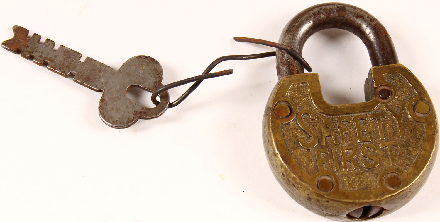 Antique ''Safety First'' brass padlock, has key and some rust. Grade: Very Good - Value: 20 to 100