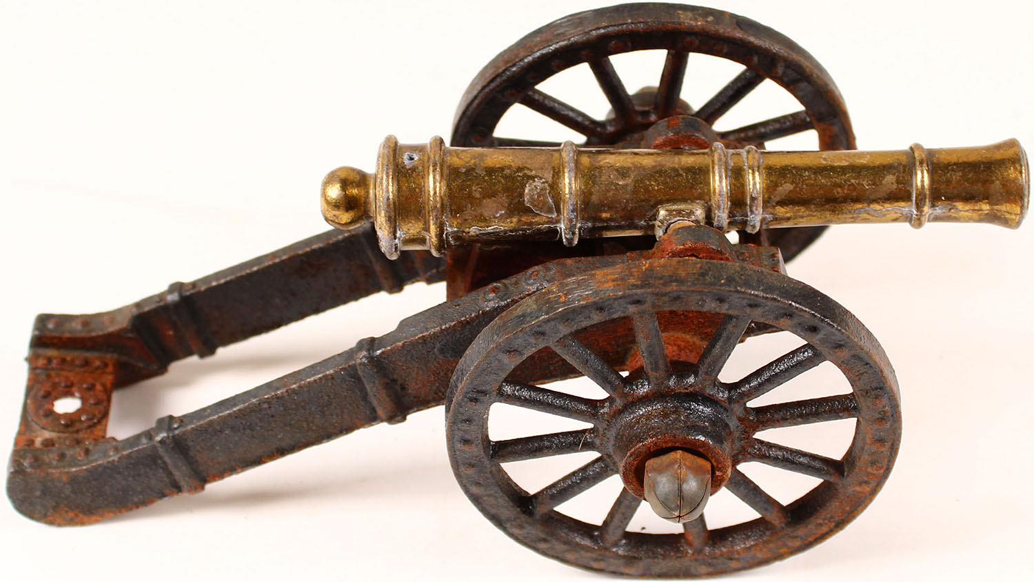 Small Vintage miniature brass & iron cannon with fuse hole, has rust. Grade: Very Good - Value: 40 to 200