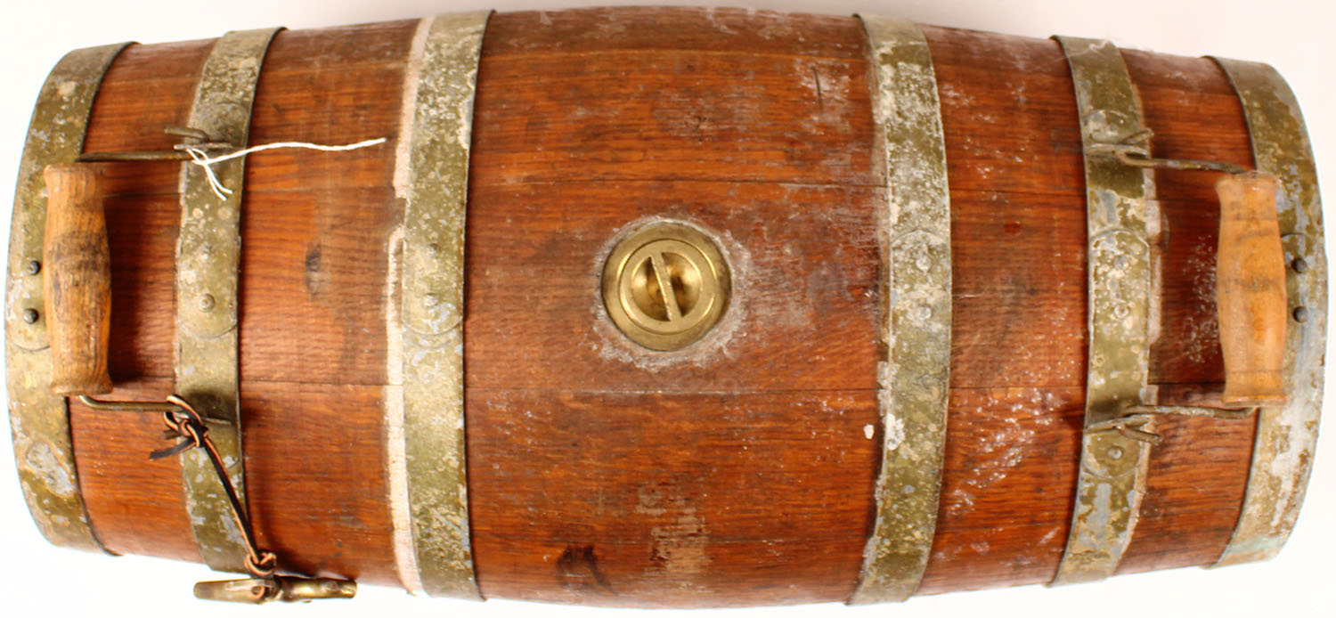 Rumles Brass Bung & Spigot Circa 1870, wood and metal barrel has age soiling, 25'' x 11'' x 11''. Grade: Very Good - Value: 50 to 500