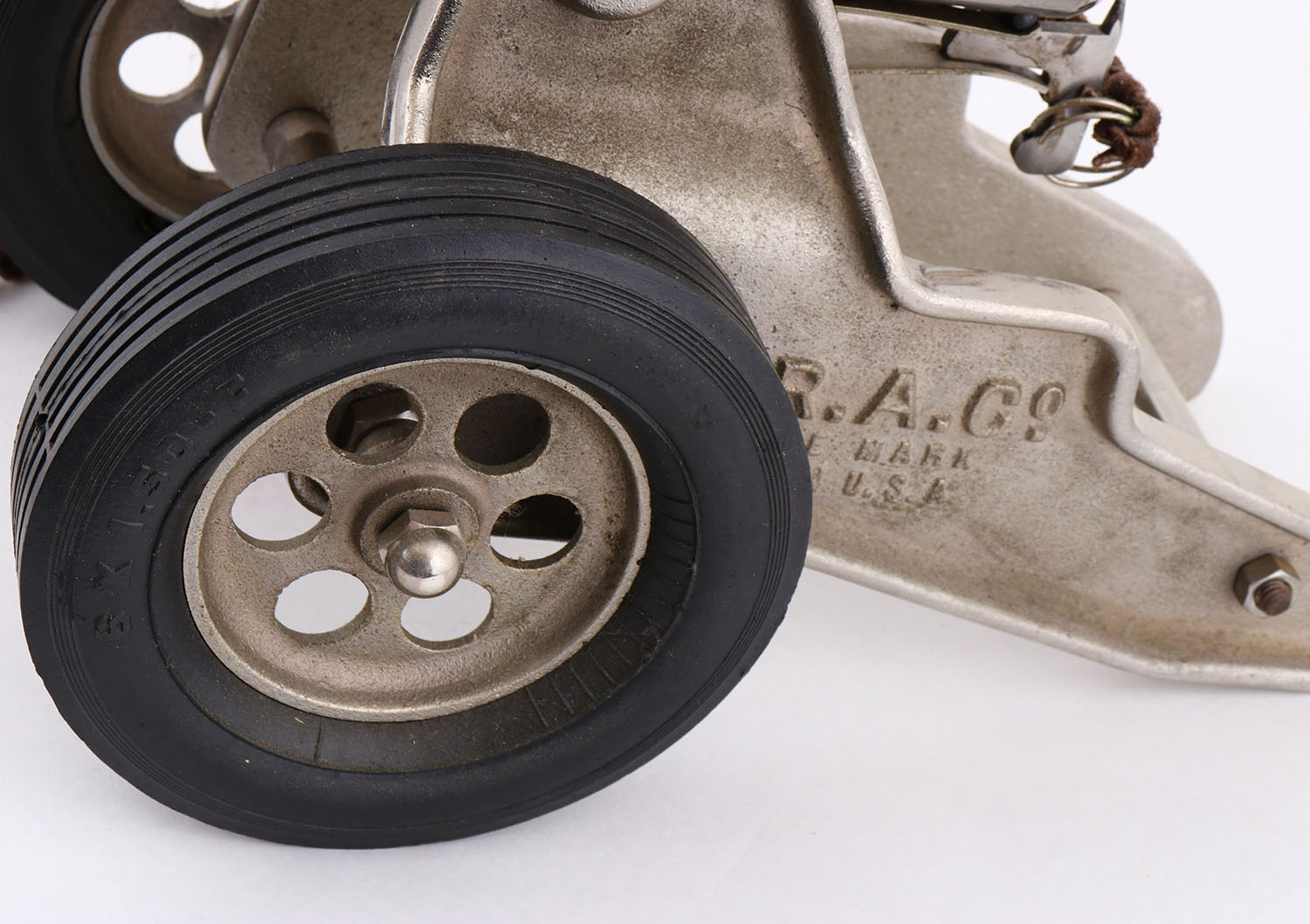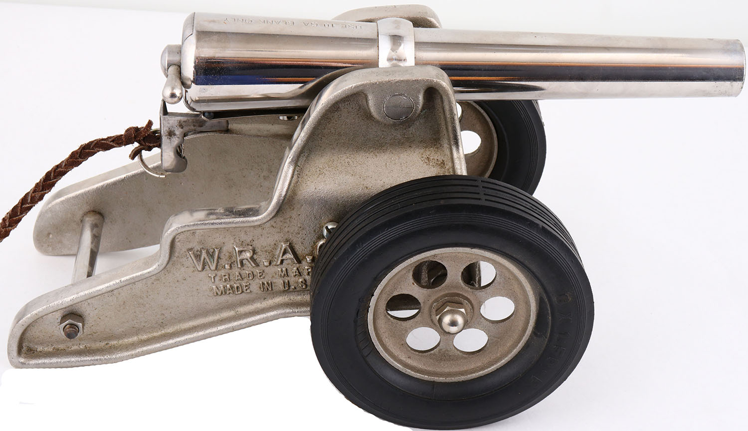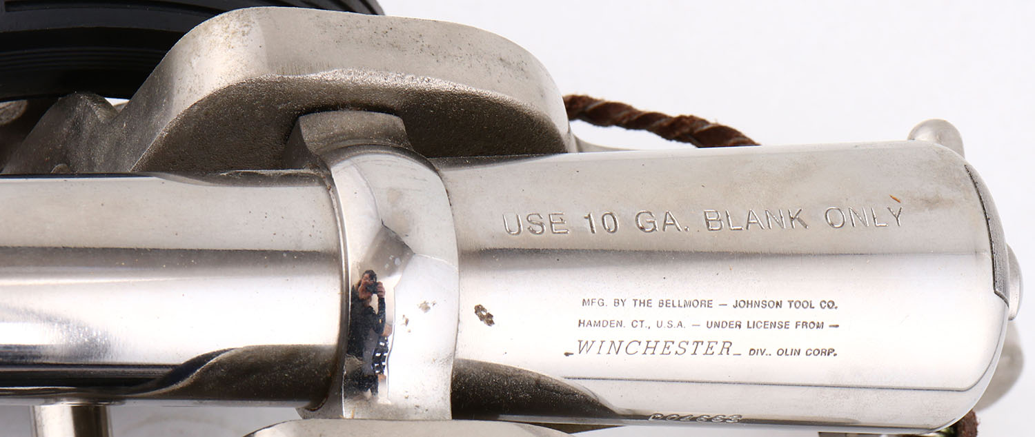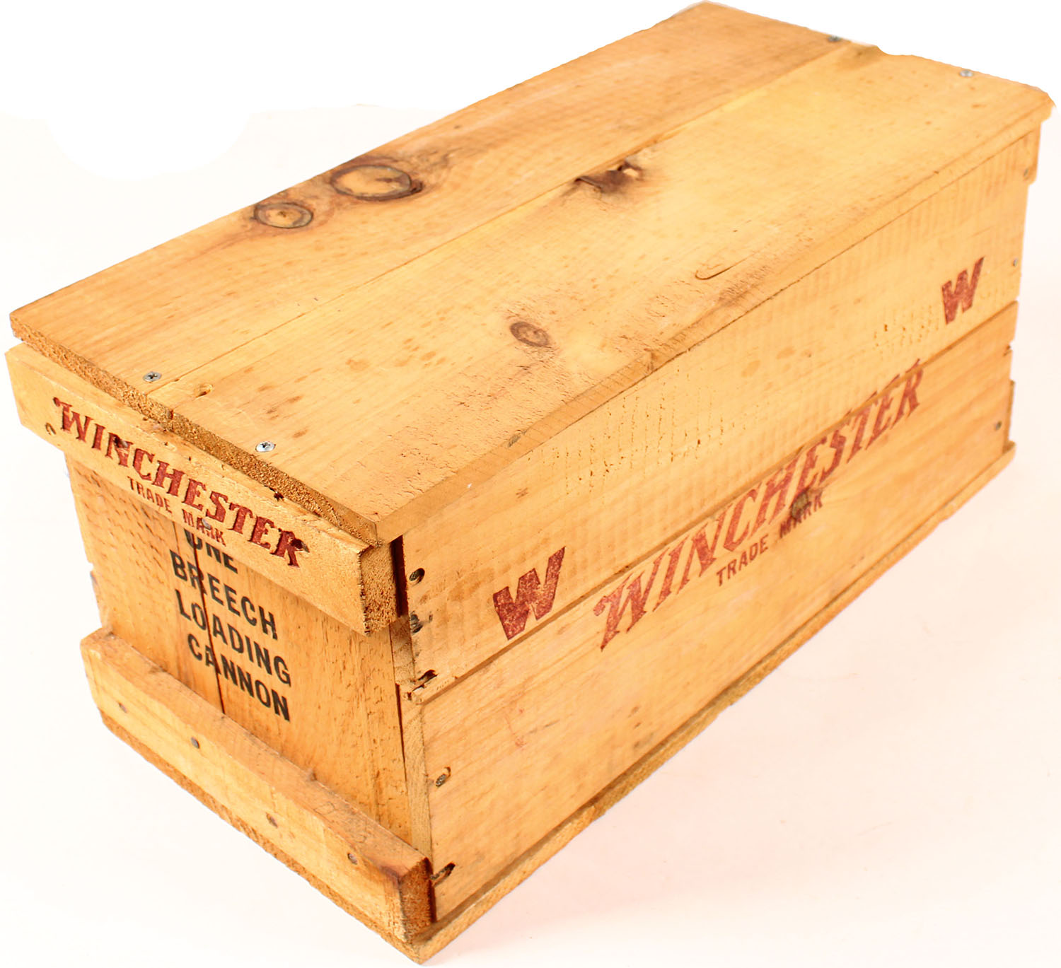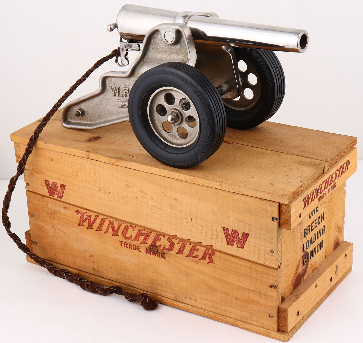 VERY RARE! Bellmore Johnson Winchester 10 ga. NICKELED Winchester Cannon, with wood box. RUBBER WHEELS, #004663, the famous Winchester Model 98 Breech Loading Signal Cannon was first offered in Winchester's 1903 catalog. It was described as: ''a breech loading cannon possessing safety, simplicity of construction, and ease of manipulation....'', The cannon is manufactured using the specifications from original Winchester blueprints. The barrel, machined from solid round bar, is mounted on a cast iron undercarriage that is cast using original patterns from Winchester. The barrel and undercarriage have a durable electro-coated finish, and the breech closure is hardened black. Very nice piece! Well marked. Grade: Excellent ++ - Value: 1000 to 3000