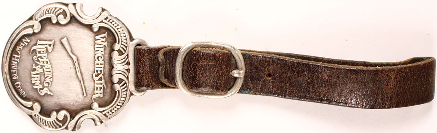 Winchester watch fob, has age soiling, has leather strap. Grade: Very Good - Value: 30 to 150