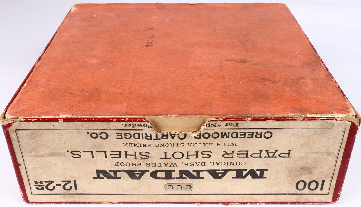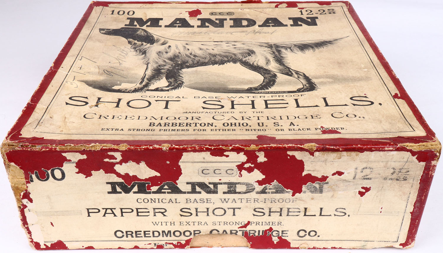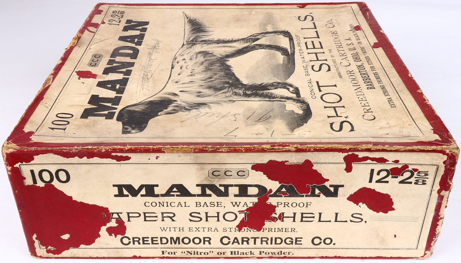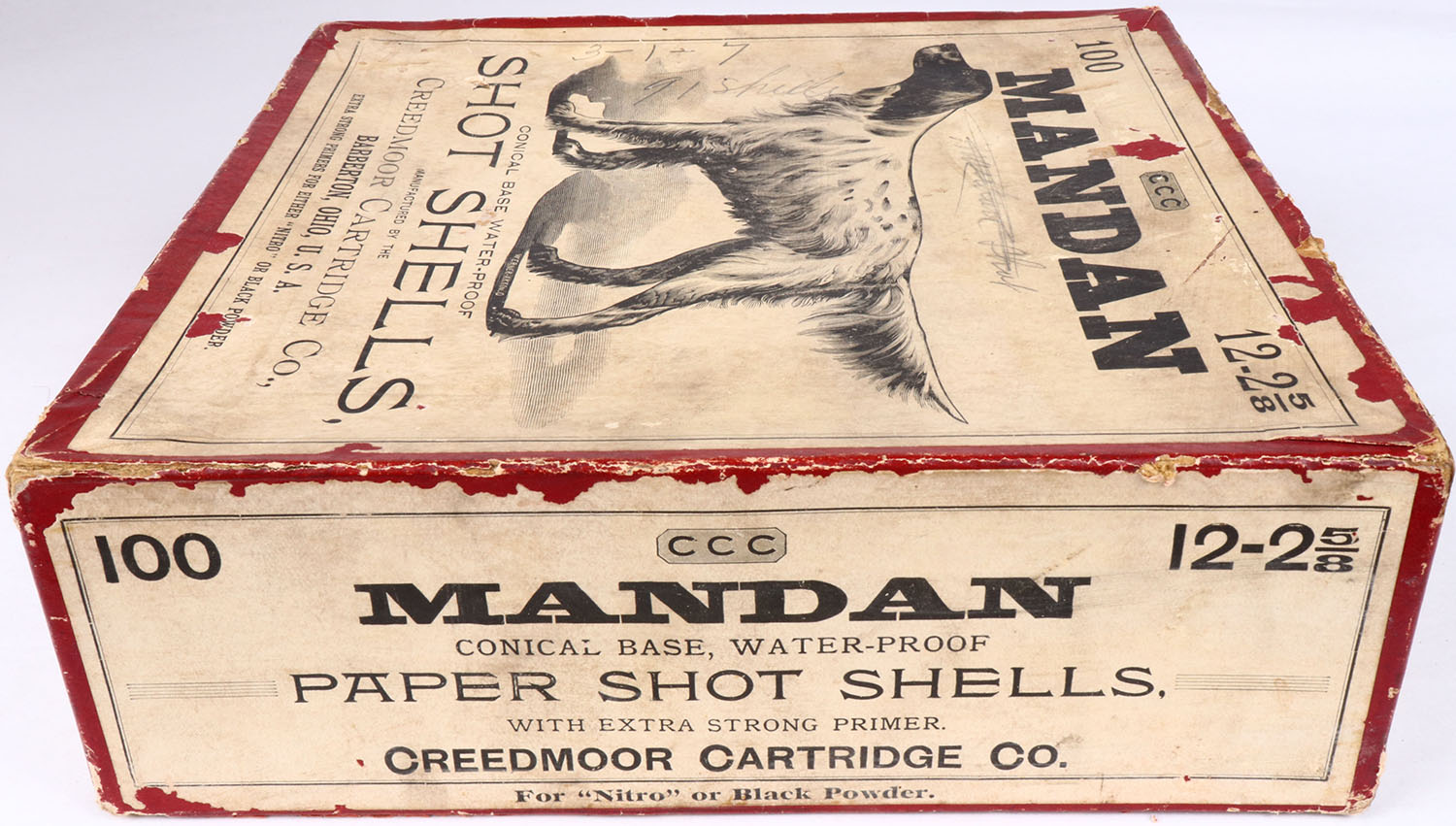 Creedmoor Cartridge Co., Mandan 100ct. Box, EXTREMELY RARE, FIRST ONE WE'VE EVER SEEN, 12ga, 2pc., Empty, 2 5/8'', Red box with buff & black label, with pointer dog on front label, box has light age soiling, scuffs & edge wear. Grade: Excellent - Value: 1200 to 4500