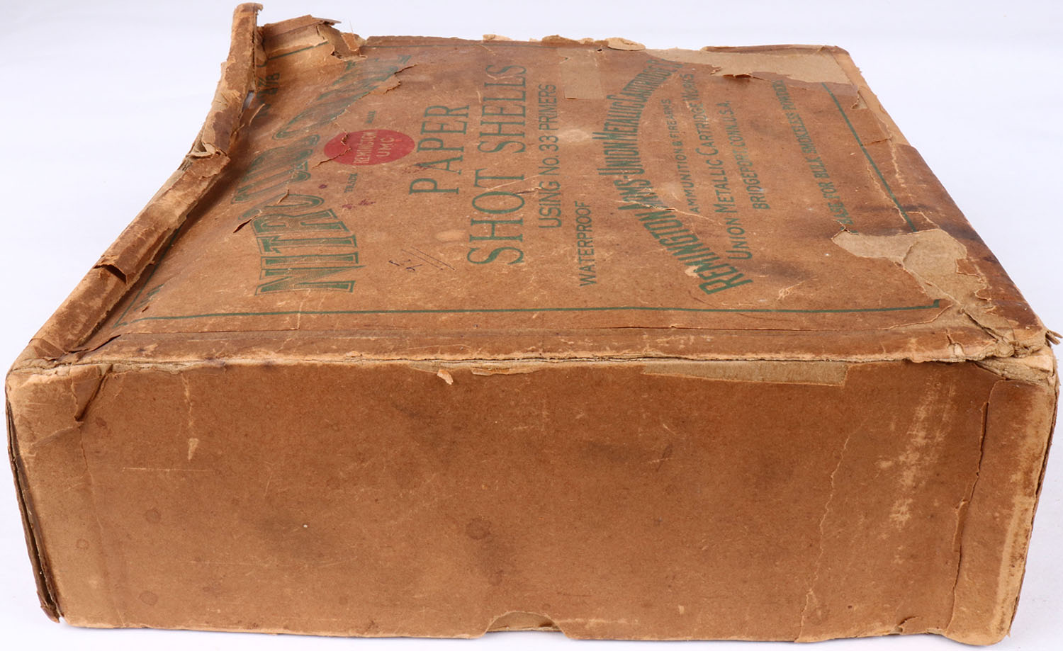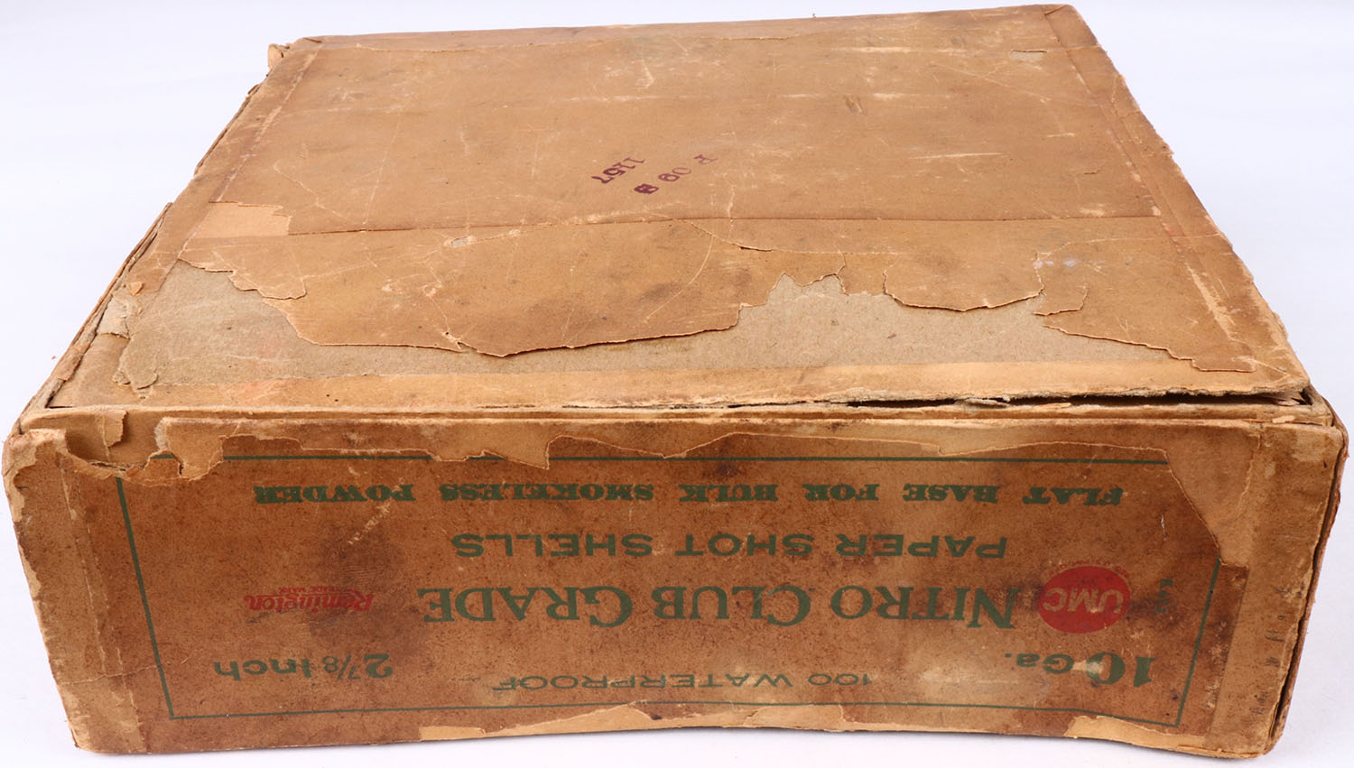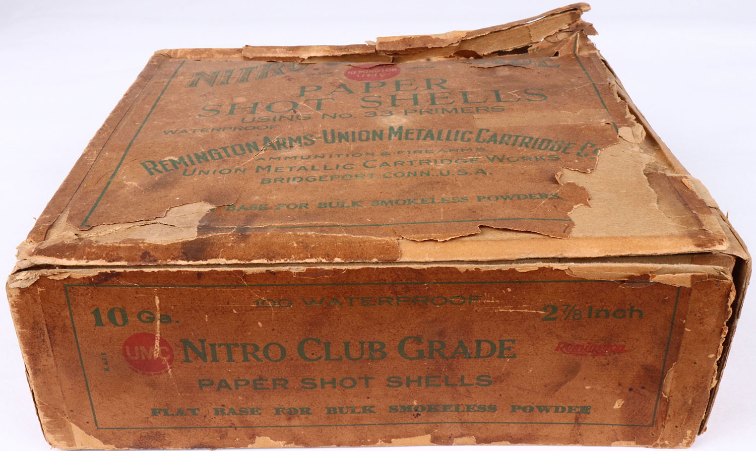 REM-UMC, NITRO CLUB GRADE, 10ga, 2pc., Partial 53% Full of NPE, 2 7/8'', buff box with green and buff label, box has edge wear, scuffing, seam splits, soiling & label is 82% intact. Shells are very good. Grade: Very Good + - Value: 50 to 150