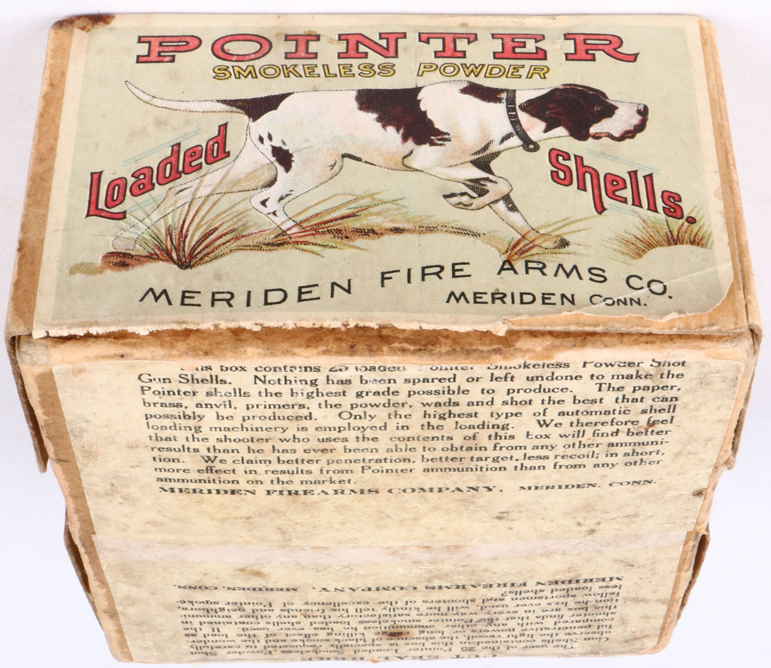 Meriden Firearms Co., POINTER, 12ga, 2pc., Partial 1rd. fired, shot size 6 correct bottom, buff box with multi colored label pictures hunting scene on top, two crossed shells on one side & pointing dog on the other side, box has age soiling with light edge wear and the label is 100% intact with very nice colors, Shell is very good. Grade: Excellent - Value: 200 to 600