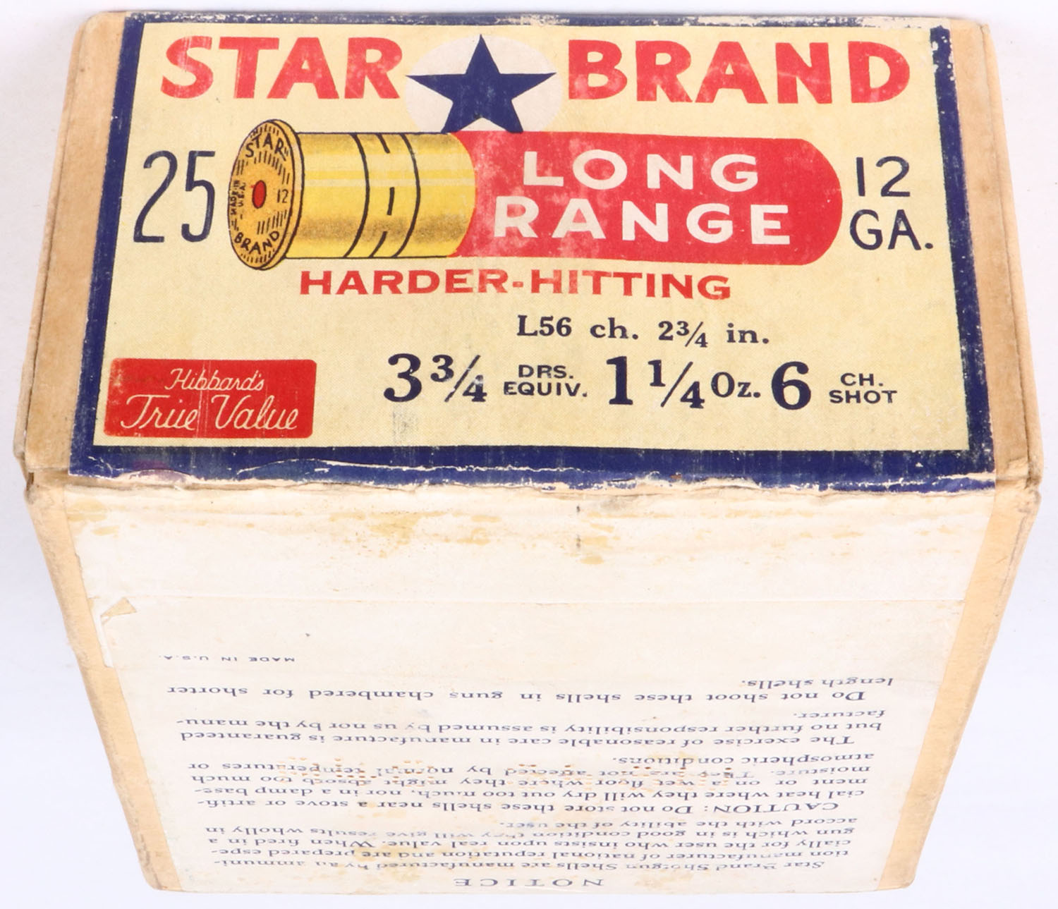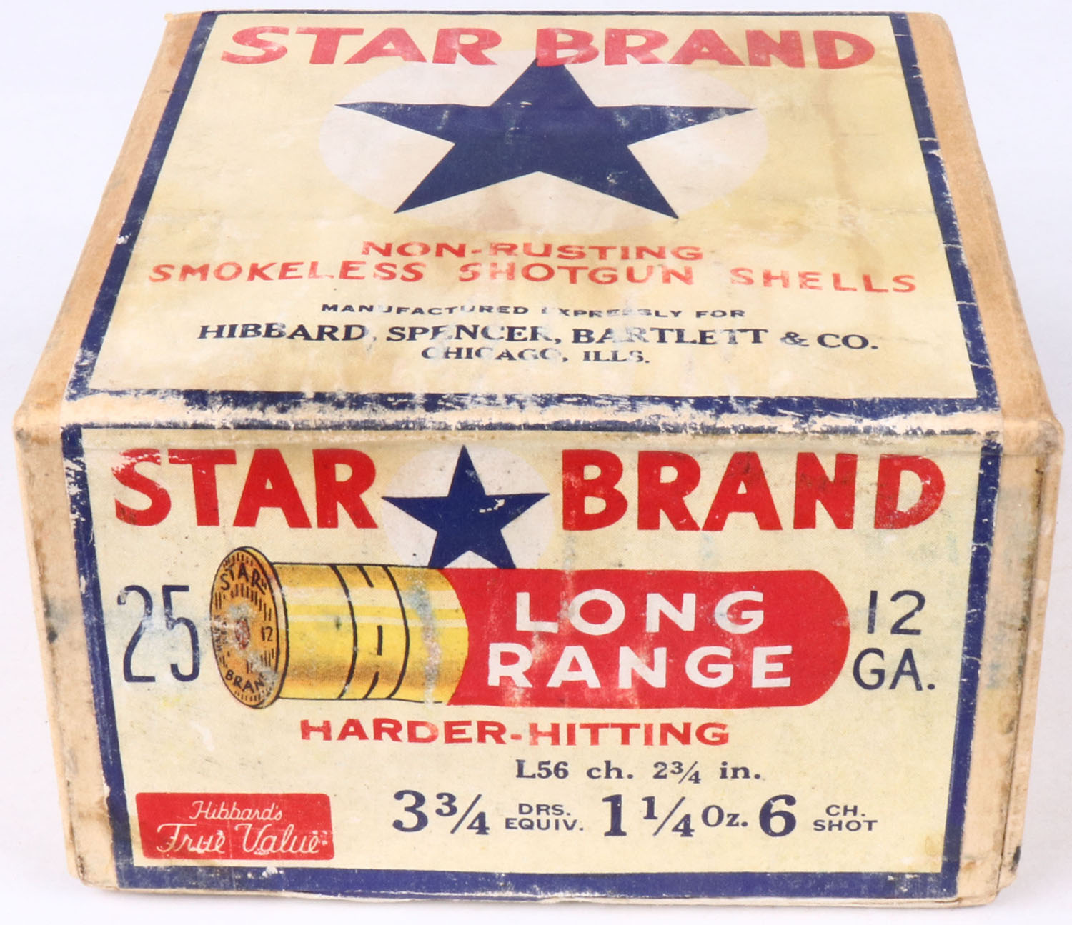 STAR BRAND, Hibbard Spencer Bartlett & Co., 12ga. Long Range Harder-Hitting, 2pc., Empty, Shot size 6 CH., L56ch, 2 3/4'', Loading 3 3/4 Drs. Equiv. 1 1/4oz. 6 CH Shot, Buff box with cream, blue & red paper label, box has light soiling, box is solid with great colors. Grade: Excellent - Value: 200 to 600