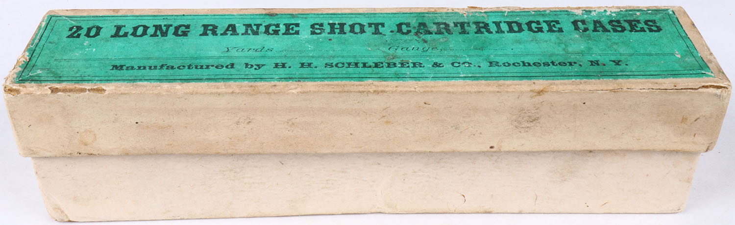 H.H. Schleber & Co., Hand Loaded Cartridges, Unknown Gauge, 2pc., Empty, shot size Unknown, Buff box with black & green label, box is very solid with great colors, light soiling & light edge wear, 100% original. Grade: Excellent + - Value: 80 to 200