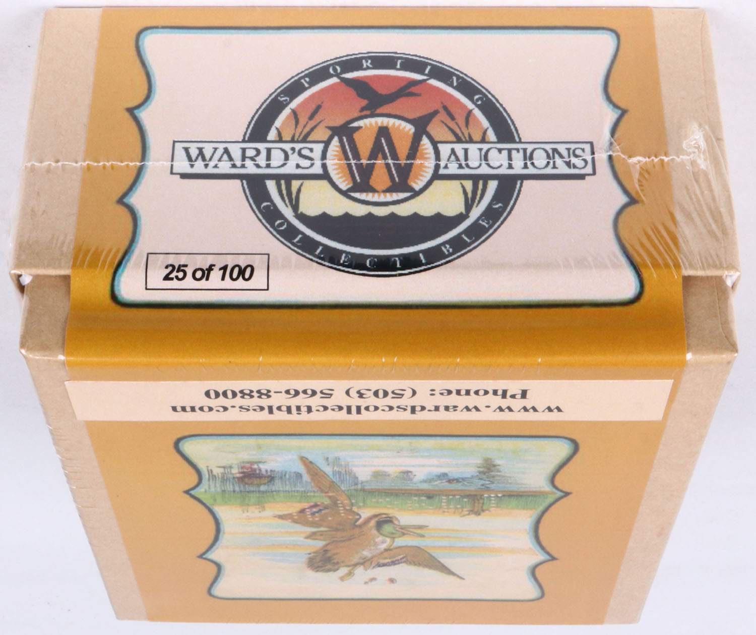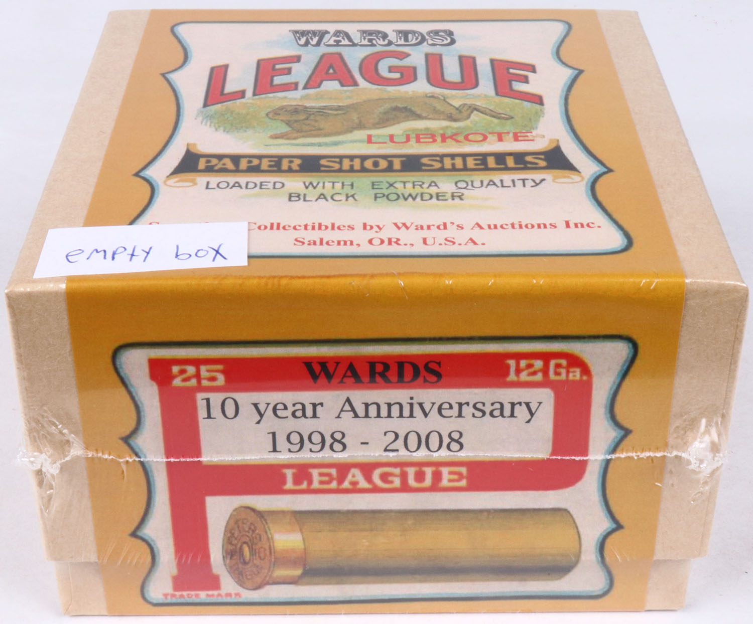Sporting Collectibles by Ward's Auctions Inc. 10 YEAR ANNIVERSARY SHOTSHELL BOX!!! To celebrate our 10 year Anniversary (we gave these away in 2008), 2pc. Shotshell boxes with what looks like at first glance as a Peters box, but we have taken their name off & added ours, we have removed all loading info & added our Logo, we have added LUBKOTE to the front, ALL BOXES ARE NUMBERED 1/100, 2/100, 3/100 & so on. This is the 25/100 box. Grade: MINT - Value: 10 to 200
