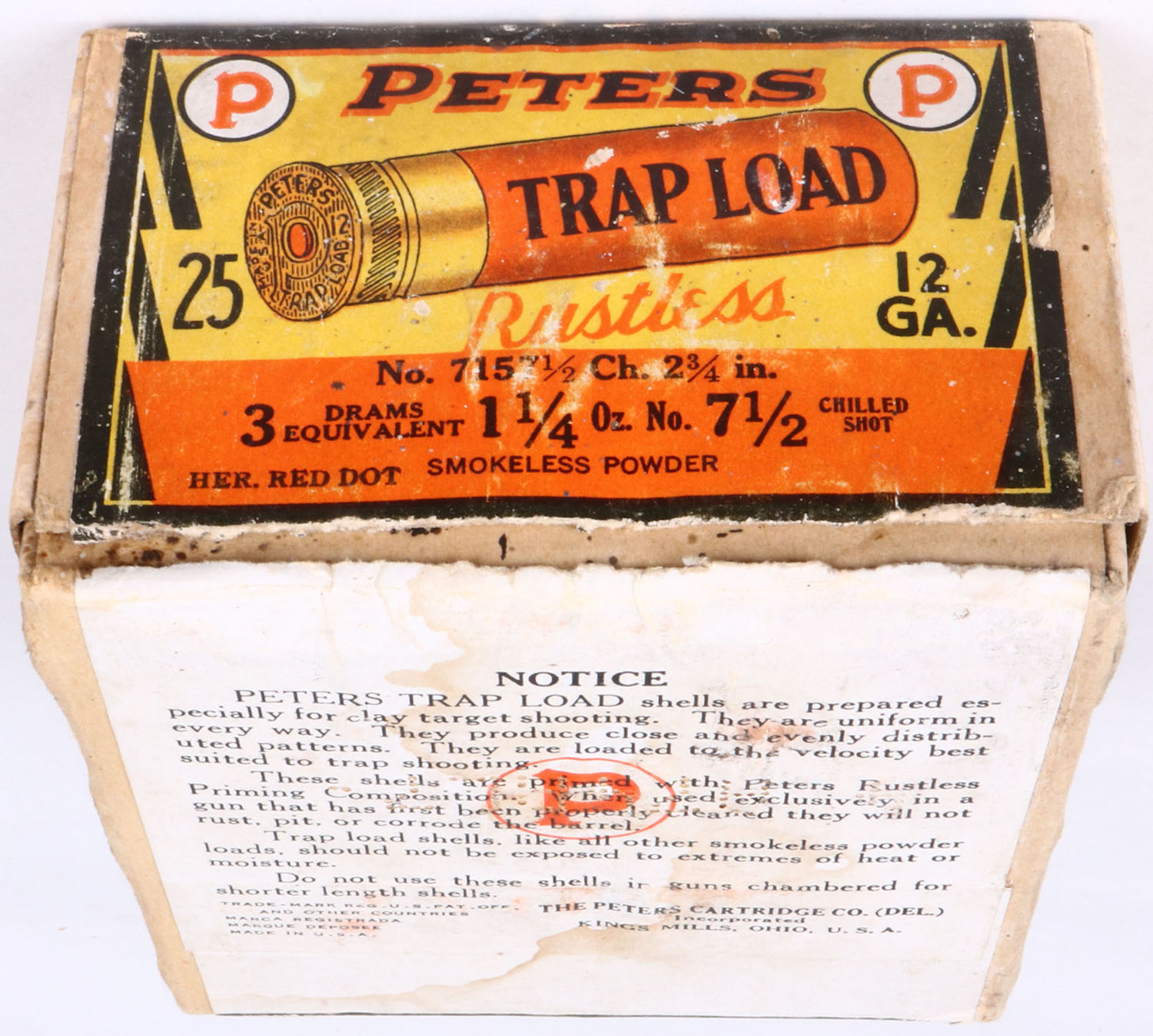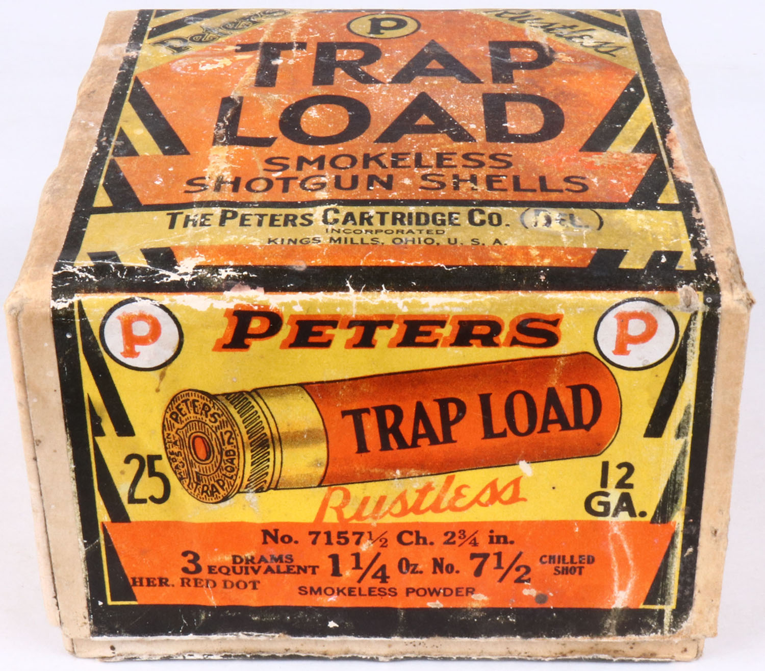 Peters Cart. Co., TRAP LOAD, 12Ga., 2pc., Full of fired shotshells some missing primers, ''HALLOWEEN BOX'' buff box with orange, yellow, white & black paper label, 7 1/2 Chilled Shot, 2 3/4'', box is solid with nice color to label, box has scuffing, age soiling, & light edge wear, Shells are good. Grade: Very Good ++ - Value: 200 to 600